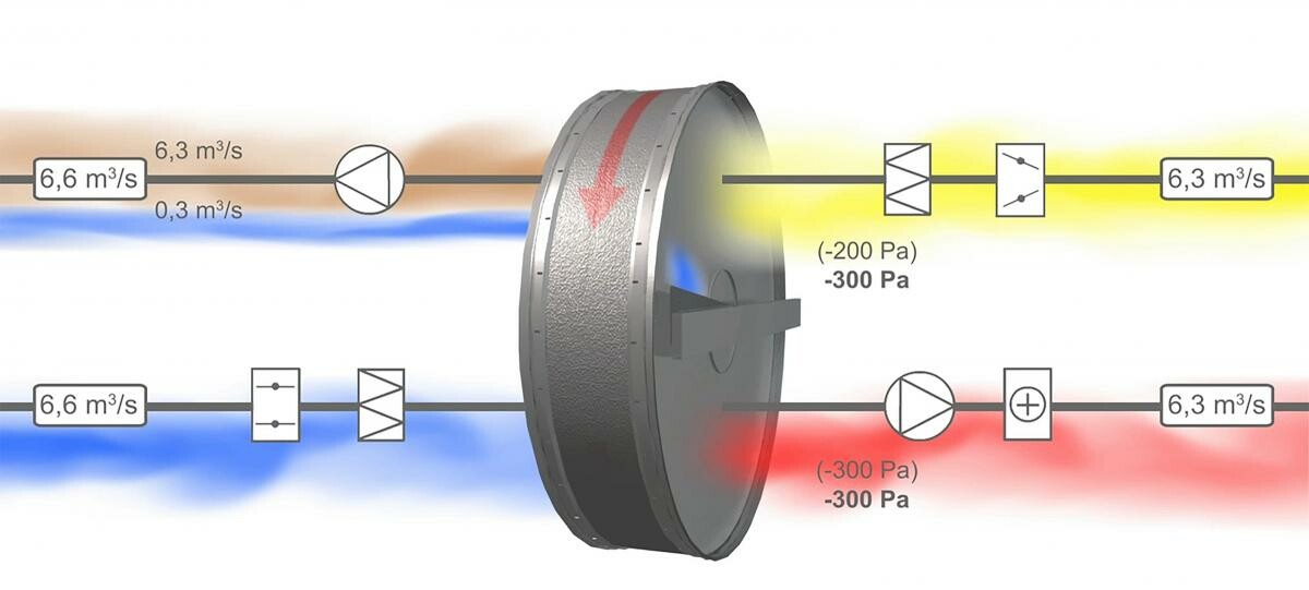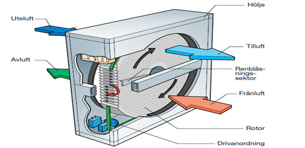 Liten del av insugande uteluften vänder om och går ut igen via avluften, så att luften i rotorn blir utbytt samt vissa partiklar som fastnat på rotorn blåses bort.