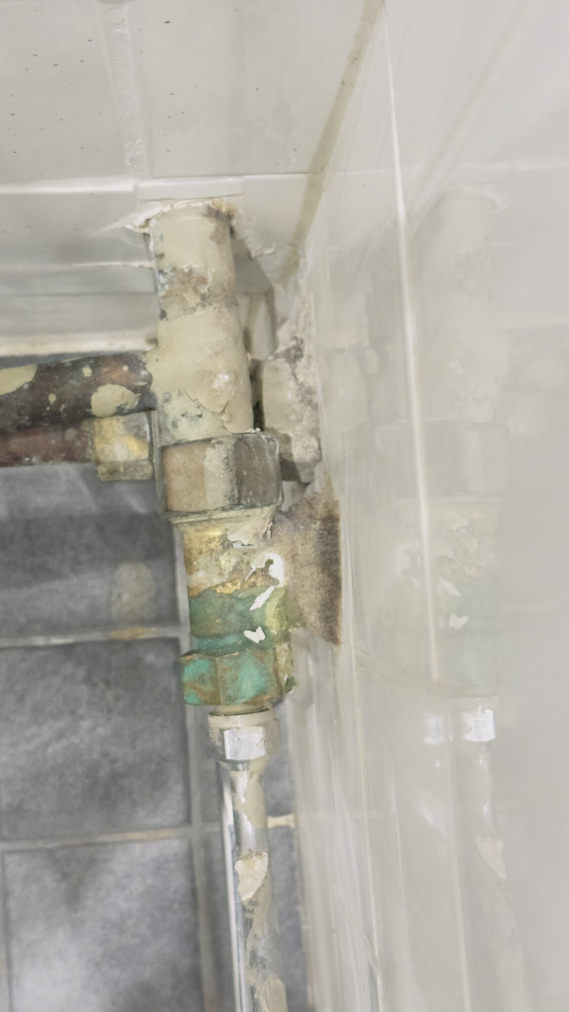 Vi har flyttat in i BRF och har precis tagit ut badkaret, då fann vi dessa stora kopparrör som går tvärs över väggen.