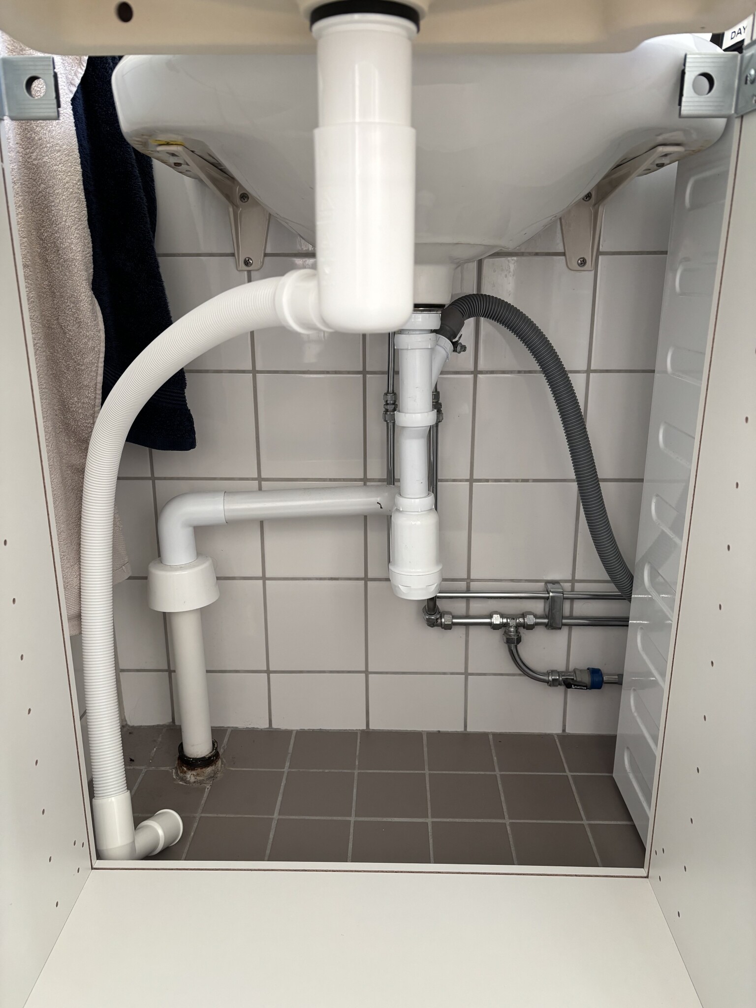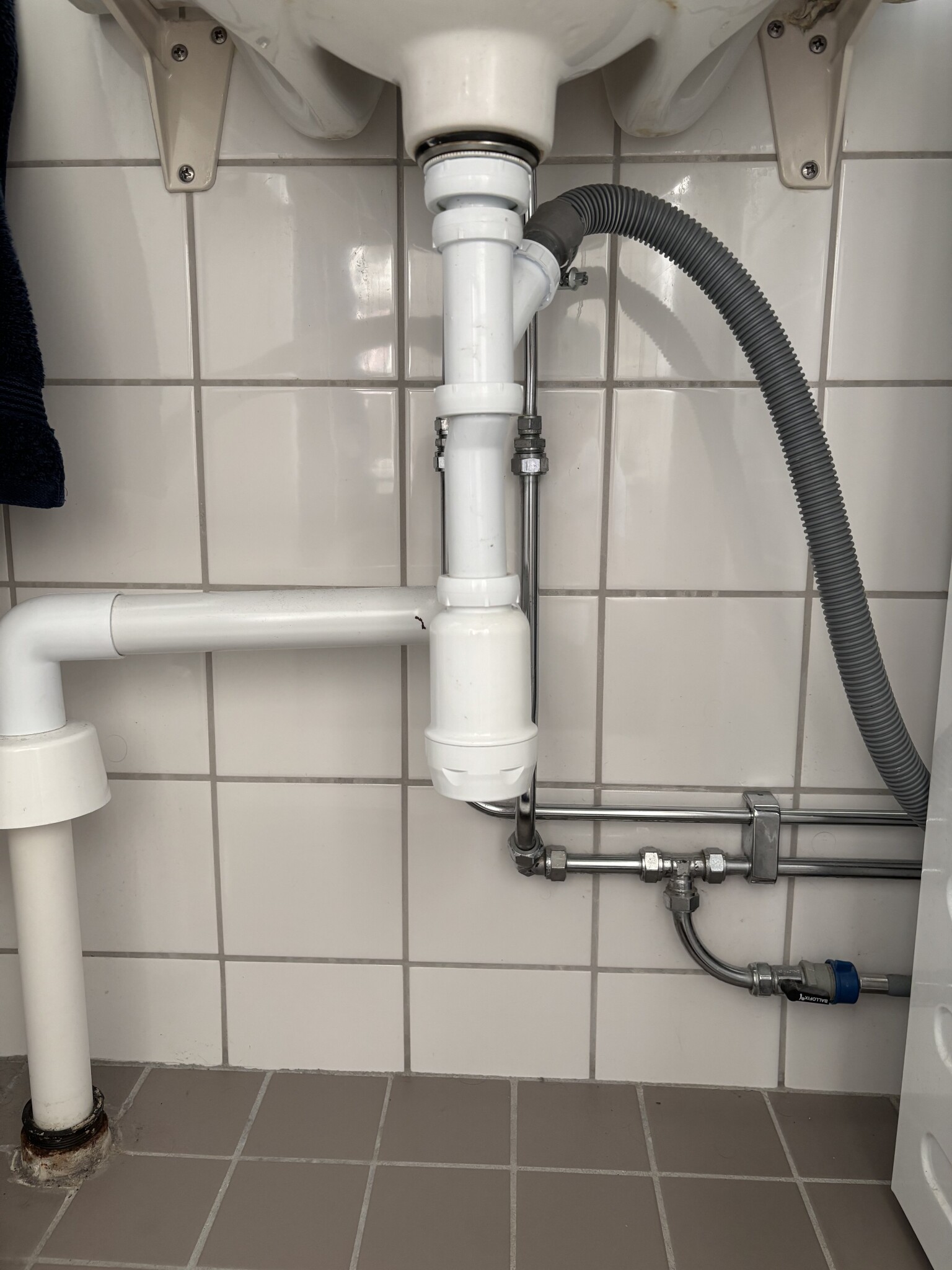 Håller på med första egna badrumsprojektet där fristående tvättställ ska bytas och fästas ner i en ny bänkskiva. Köpt ett vattenlås från tillverkaren av det nya tvättstället (INR) med en ”easy clean” lösning man kan lyfta ur uppifrån istället för att krångla under. Bilderna visar det gamla monterade avloppet med koppling för tvättmaskin (grå slang) och sedan sedan en bild med det nya vattenlåset framför (med vit slang).