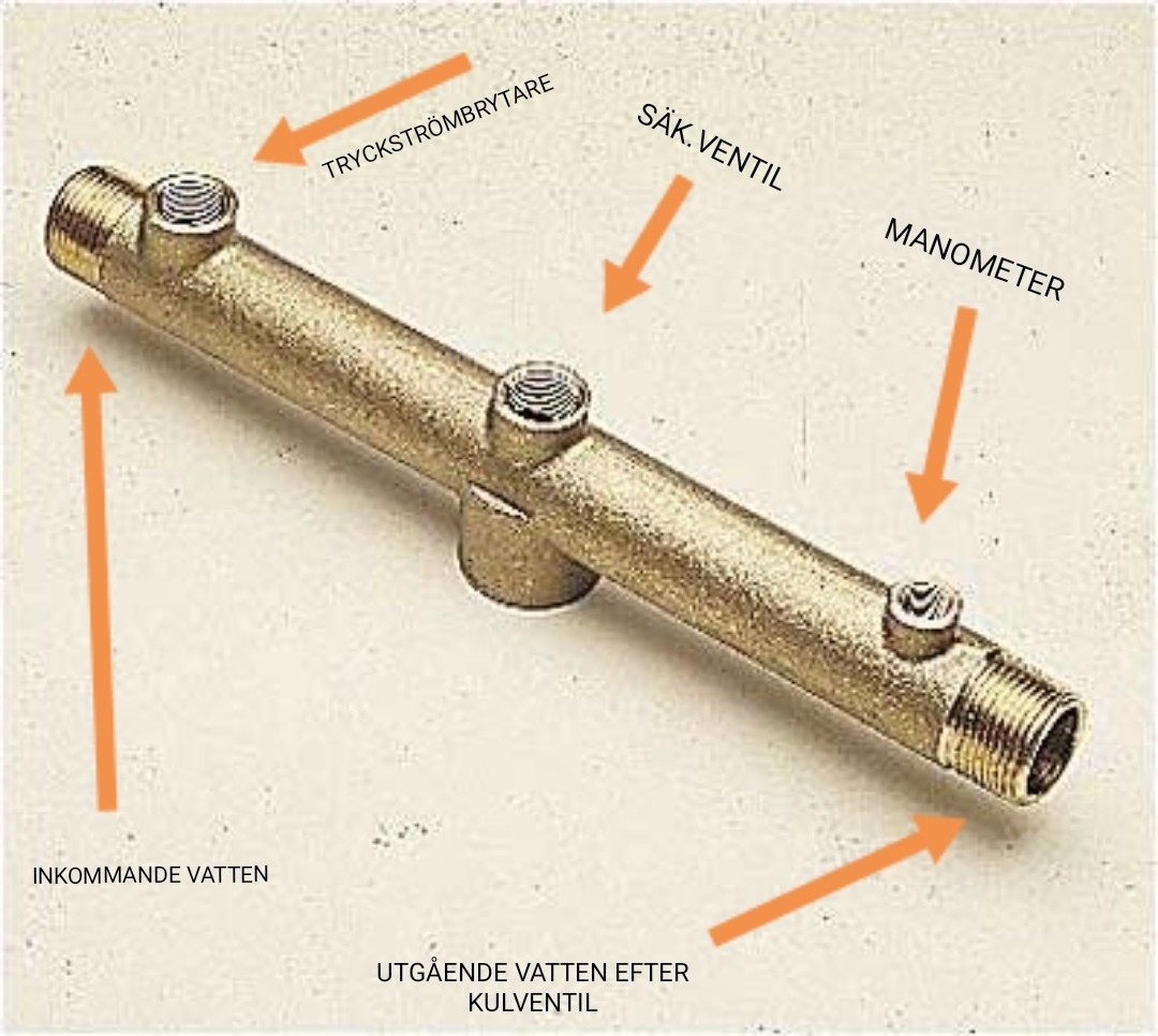 1. Samlingsrör med tryckströmbrytare, manometer, SÄV direkt vid inkommande från brunnen.