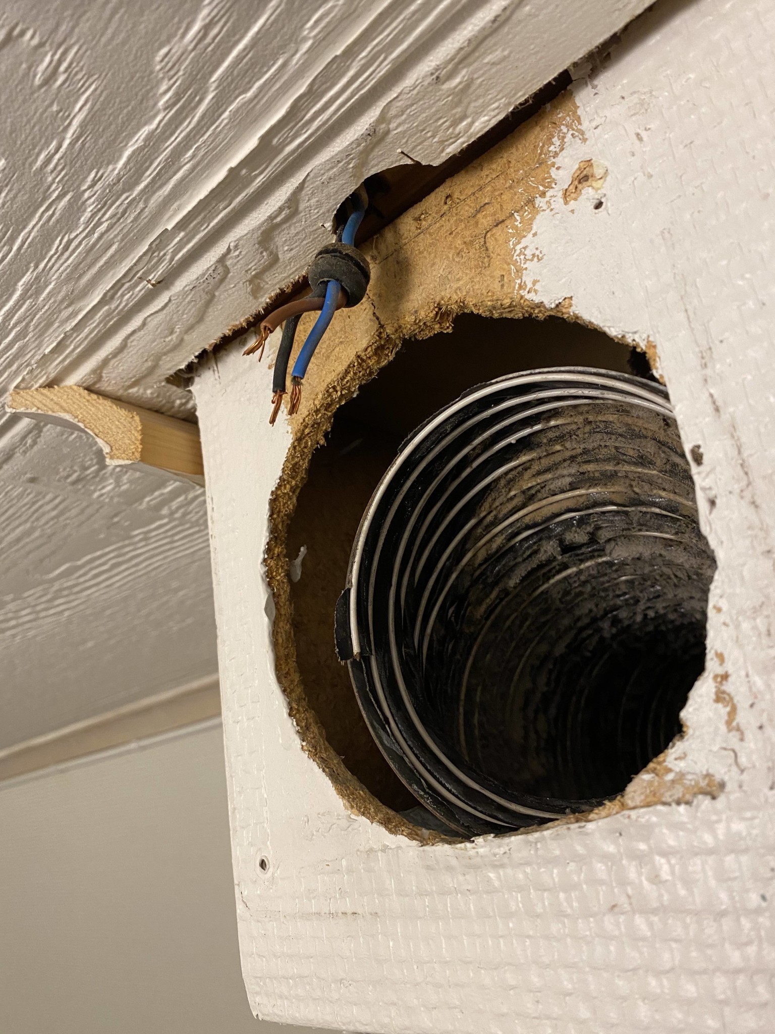 Det är en sån äldre vit slang de ligger i. I badrummet finns jord vet inte om det finns till fläkten? Badrummet är inkopplat i efterhand till jordfelsbrytare.