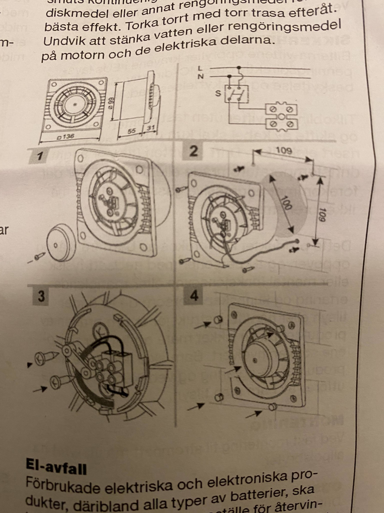hur kopplar jag in dessa? Saknas även märkning för N och L på fläktens sockerbit. Vart ska nolla/ fas kopplas?