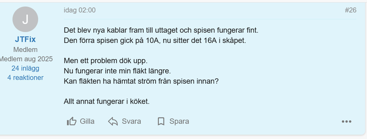 Då tolkade jag det du skrivit. Att före omdragningen så funkade allt, Elektrikern drar om kablar till din spis, grejar i centralen. Han kollar inte att grejerna fungerar, du upptäcker att din köksfläkt inte fungerar. Eftersom du nu kollat att ditt uttag till köksfläkten nu är död, så kan man ju misstänka att hans grejande i centralen har påverkat funktionen för uttaget.