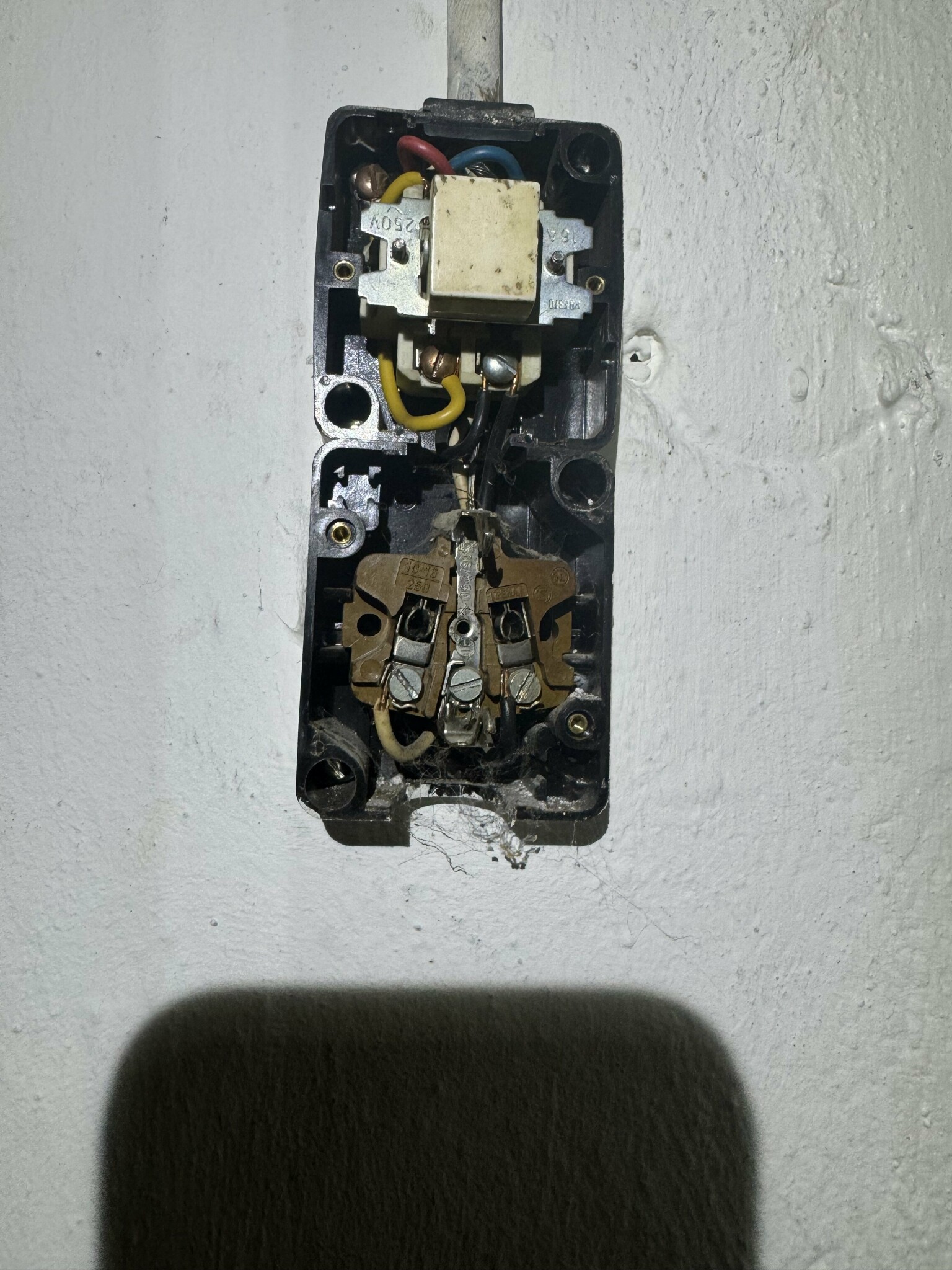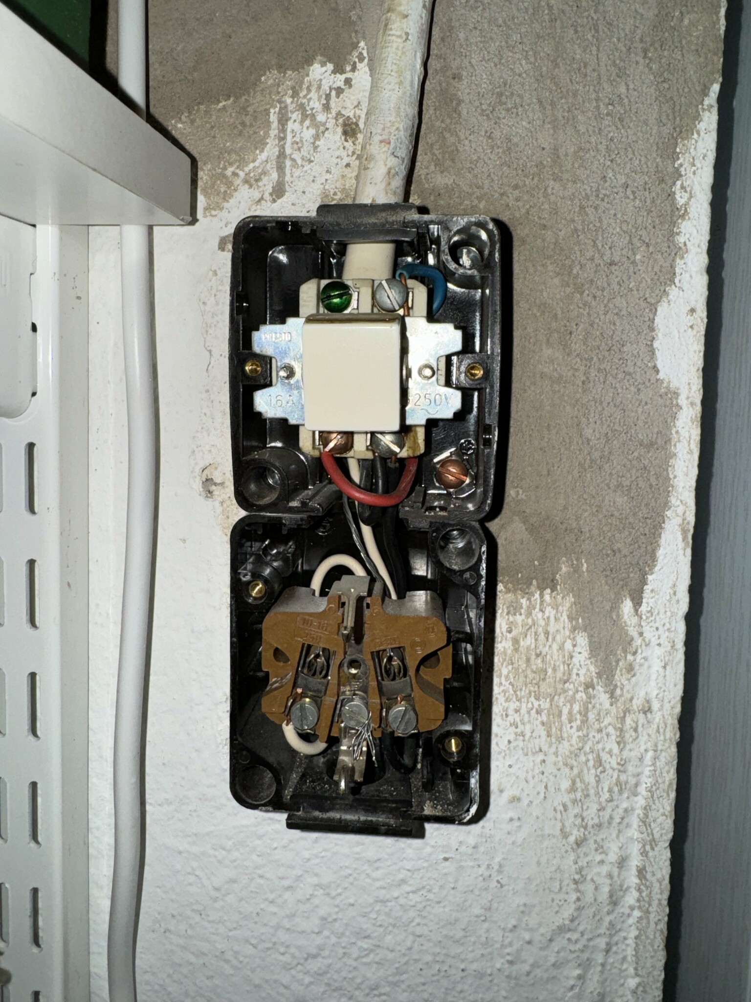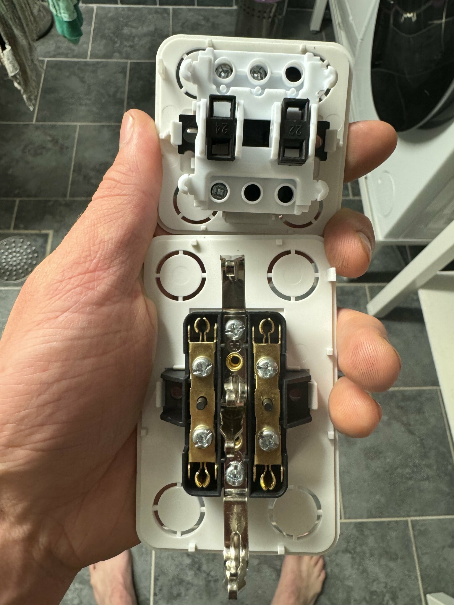 Öppnade även den andra strömbrytaren och där var röd kabel ansluten direkt till nedre plinten. Mest troligt är gul kabel skarvad på första strömbrytaren för att den var för kort.