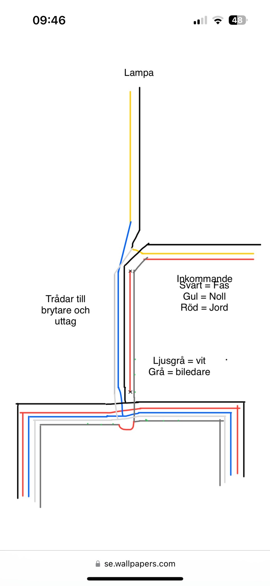 Dock är frågan vad den gula tråden har för funktion då den bara är ansluten i strömbrytaren. Glömde nog skriva att detta är en ”trapp” variant. Det finns en likadan uppsättning på andra sidan rummet som styr samma lampa. Har denna gula tråd med det att göra?