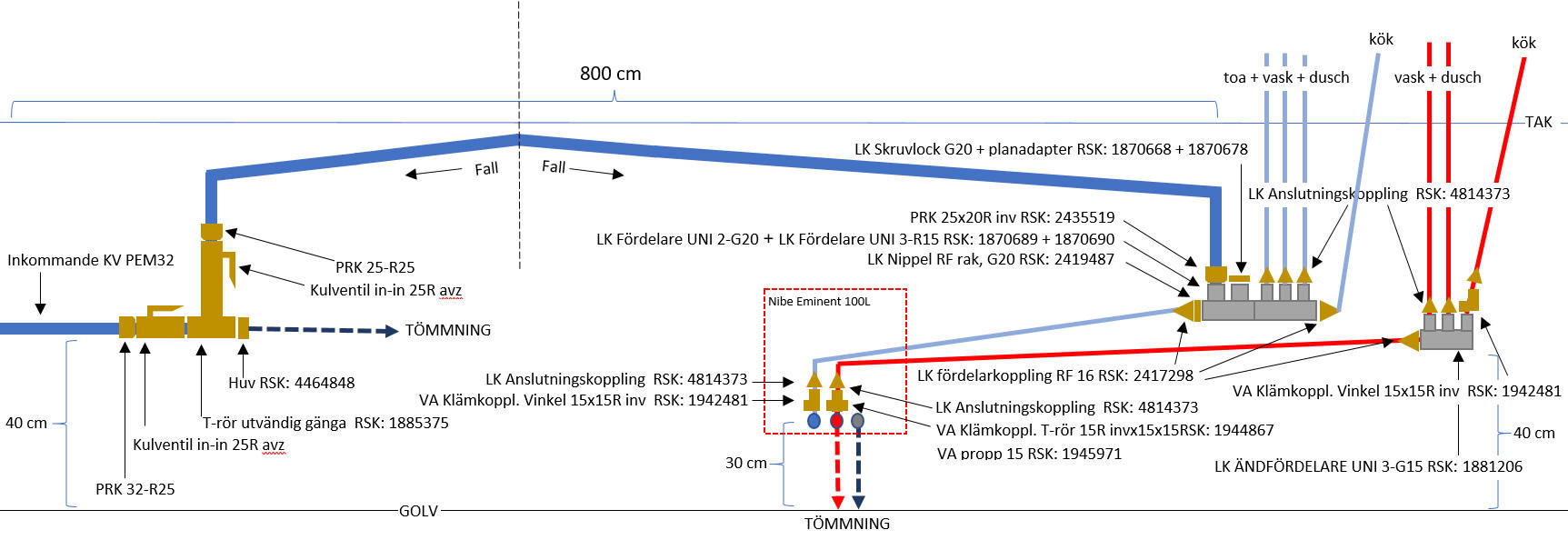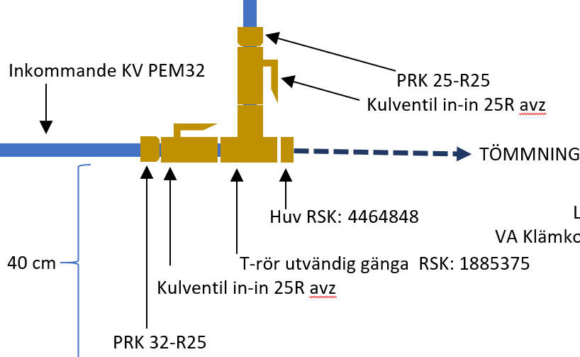 Den andra kulventilens placering kommer sig av att jag kanske skulle vilja tömma inkommande vatten utan att tömma husets vatten, alltså tömma den delen som ligger i kulverten in till huset utan att för den delen behöva tömma husets vatten. Jag kanske tänker fel här……