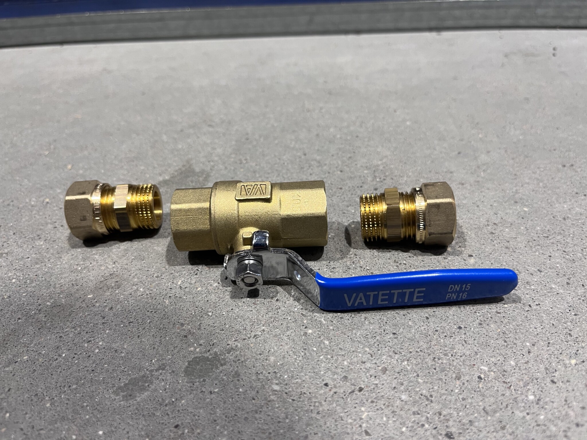 Ut till höger ska jag vidare med 15 mm cu-rör + kulventil. Inga problem där eftersom där är 15 mm klämringskoppling på avsticket.