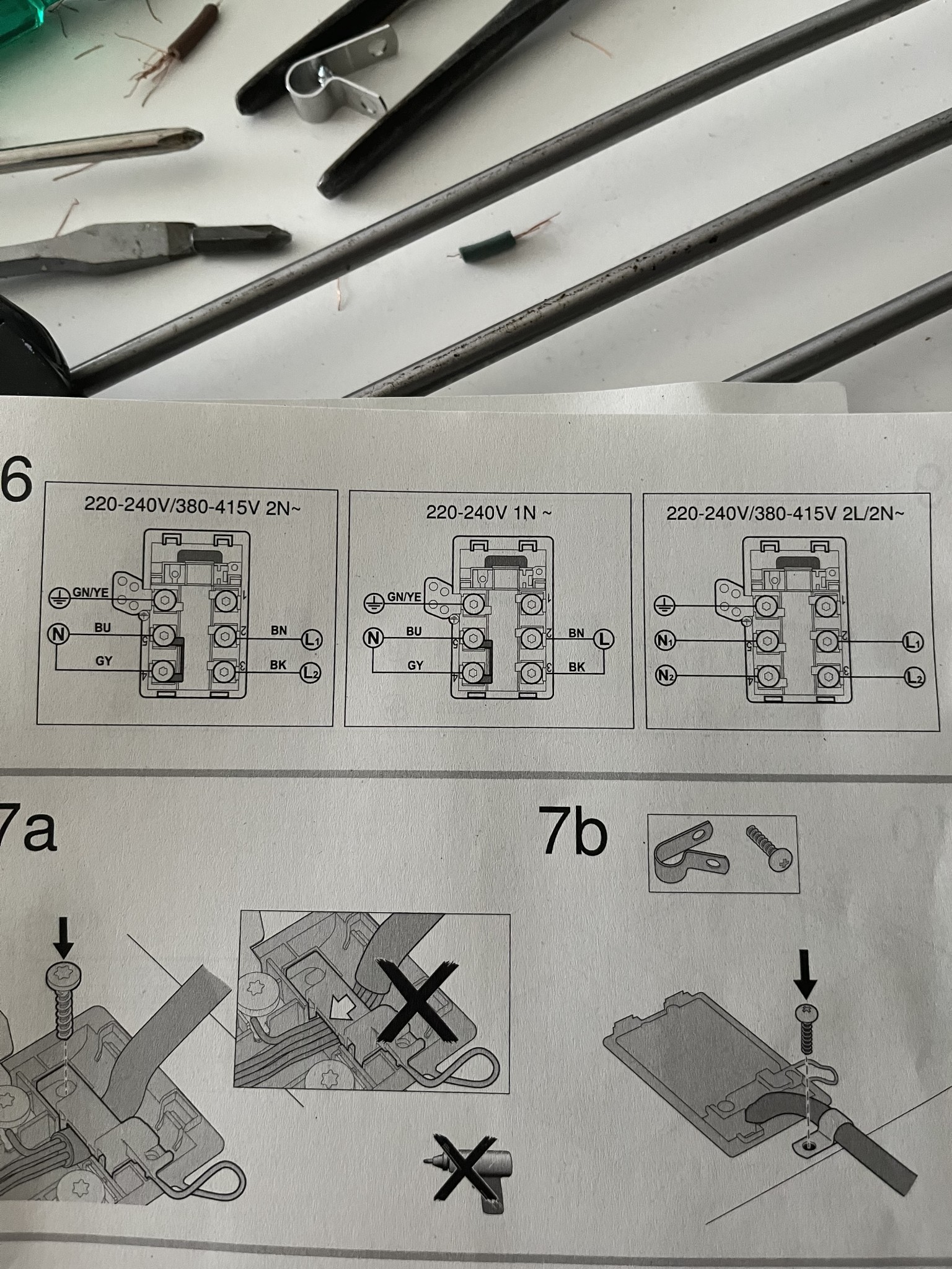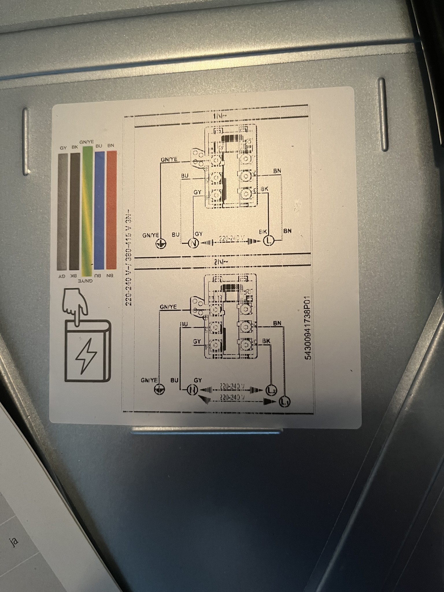koppla enl "220-240V 1N~" på den bilden är ju Nollorna kopplade med bleck markerad med fet svart färg det är ochså så det var redan utan ändringar. medans dit L skall kopplas finns ingen fet svart markering att där skall det sitta en av de parkerade bleck??J John Seger skrev:a du har rätt de har uppo ner schema . altså blir det fel om jag kopplar helt enkelt L till en av L platser 0 Till en av 0 platser och jord till jord måste de gå ström till båda L platser altså bleck mellan L 1 plats och L2 plats i dosan