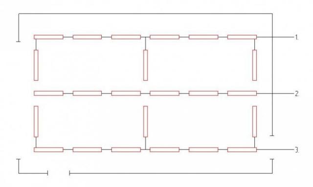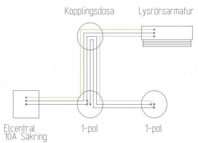 De var tänkta att kopplas som på första bilden tills jag fick höra att det var olämpligt att koppla så många armaturer till en strömbrytare. Brytarna är Eljo i varje fall. Det blir 9st 2x36w på krets 1 och 3, nr. 2 borde klara sig med 6st 2x36w.