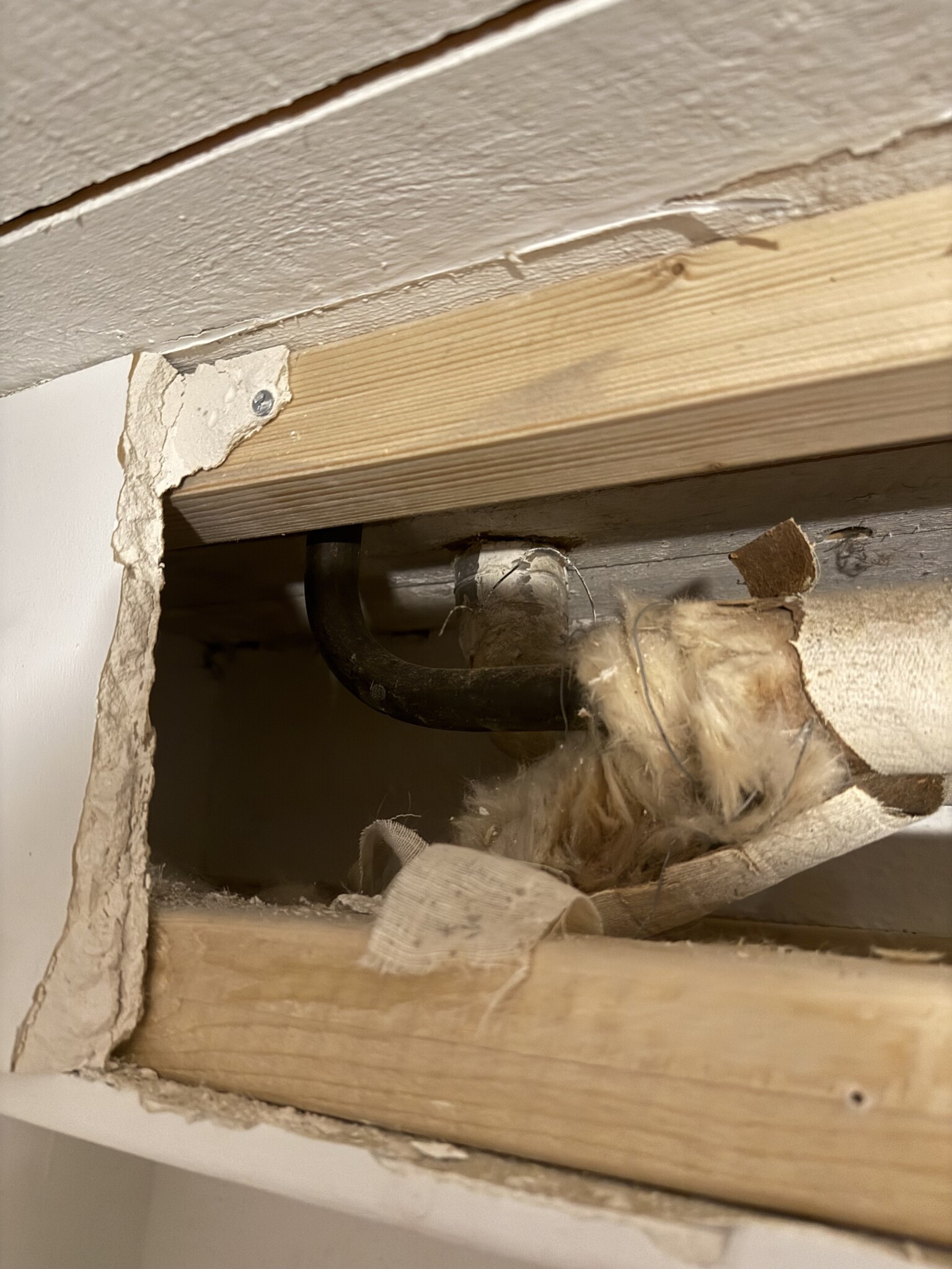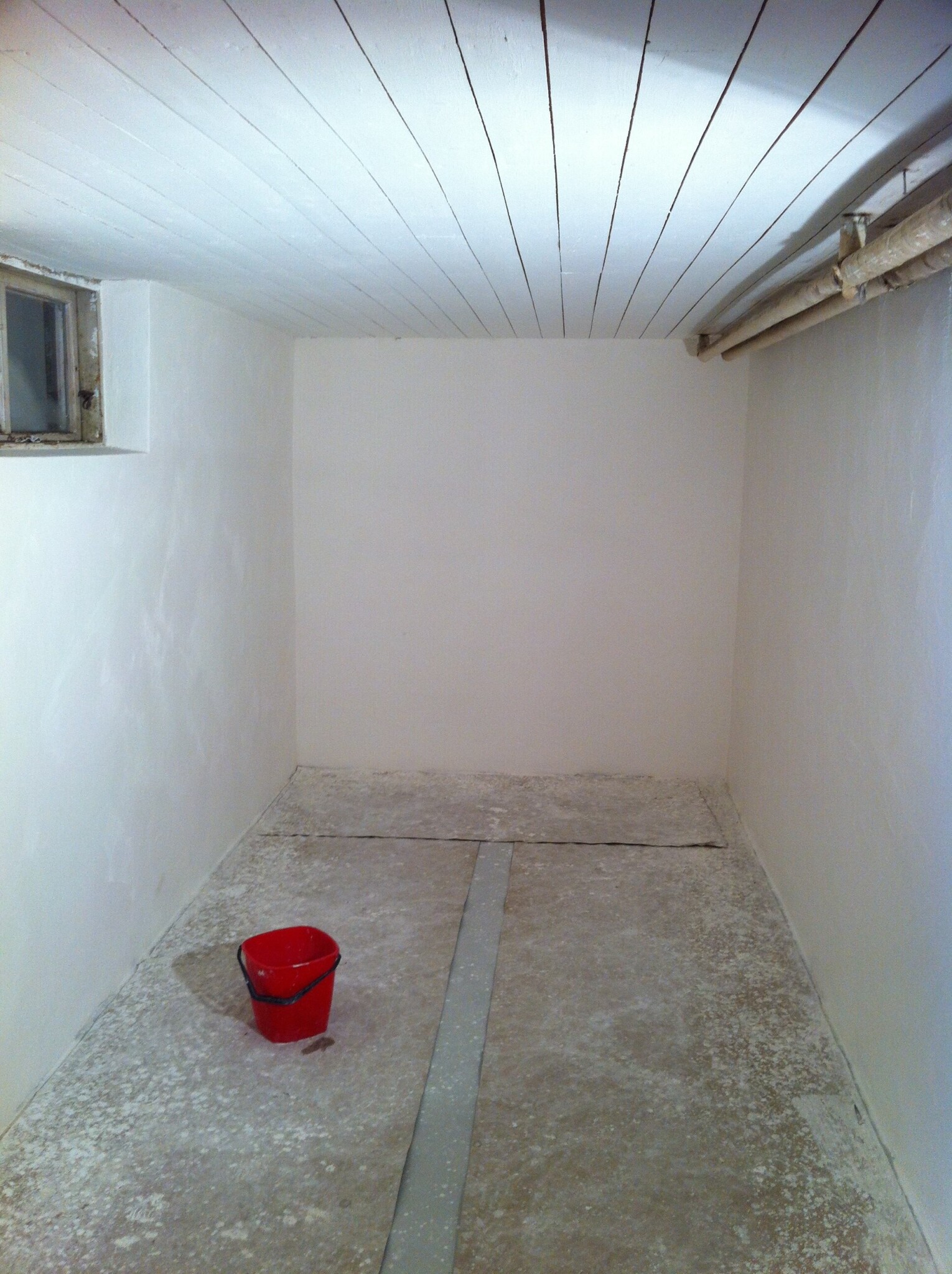 I ett av rummen som agerar kontor går det en radiatorslinga i taket till som matar vardagsrummet ovan, här är en bild från när vi just flyttat in i huset 2013 och källaren höll på att renoveras: