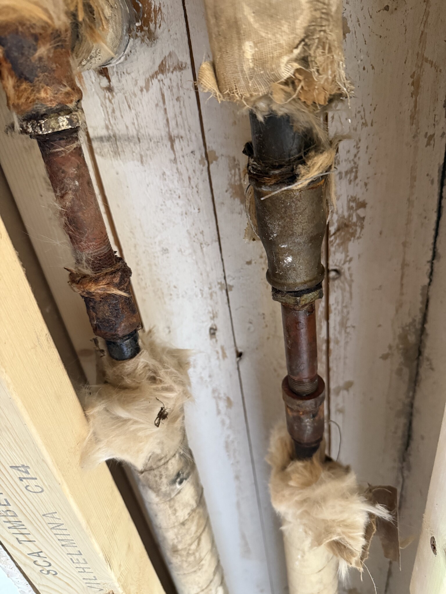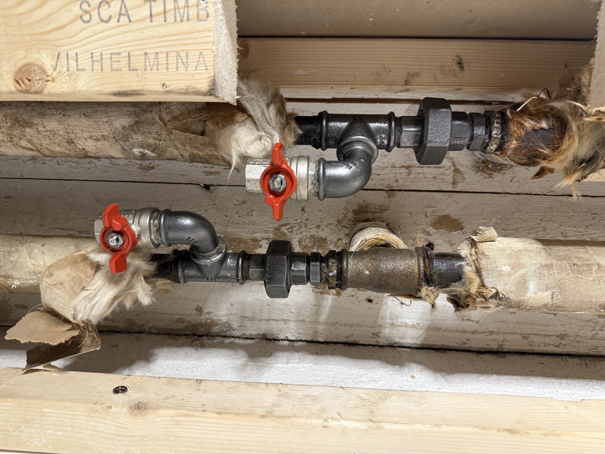 Som ni ser löper den längs taket och har ett avstick uppåt som matar radiatorer mot öst och väst, och en som fortsätter och matar en radiator mot norr. Sedan dess har jag byggt in radiatorslingan i en låda som jag nu delvis demonterat för att inspektera möjligheterna. Jag hade en förhoppning om att det skulle finnas en gängad vinkel i bortre änden som jag kunde koppla in mig på, men ack som jag bedrog mig: