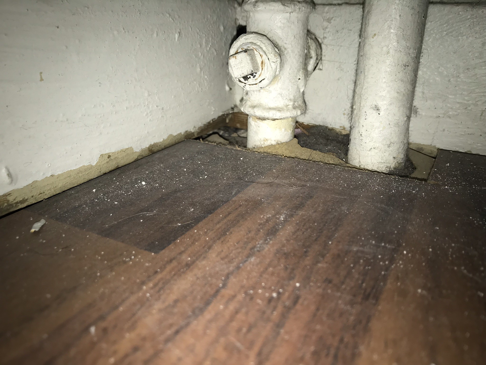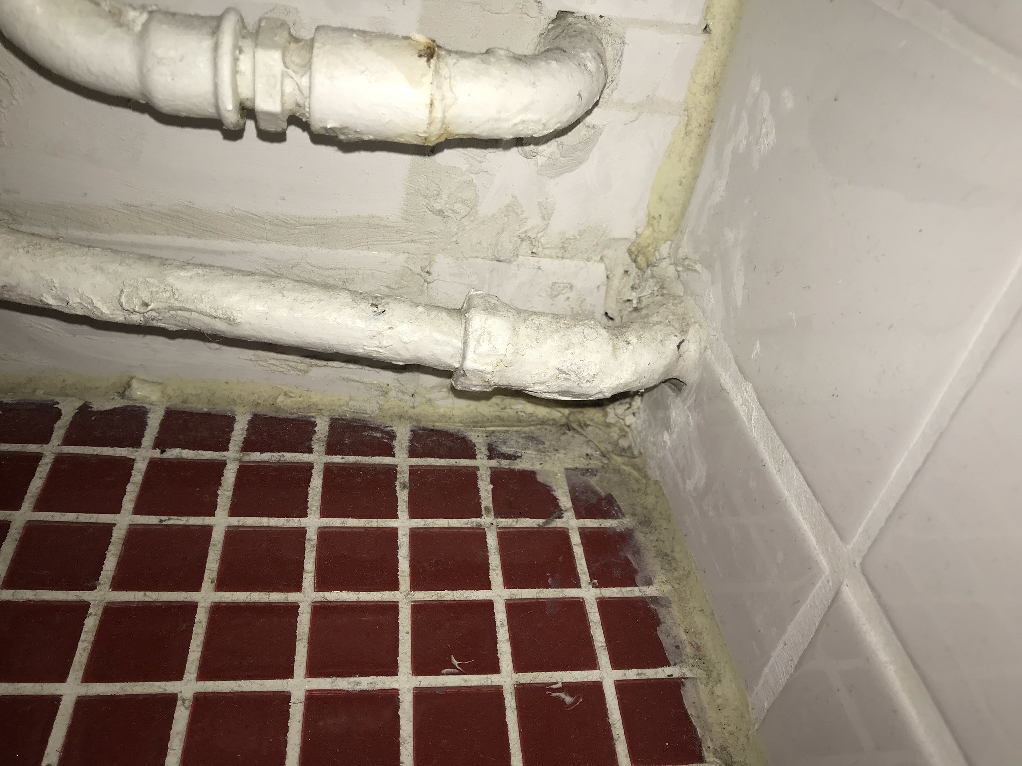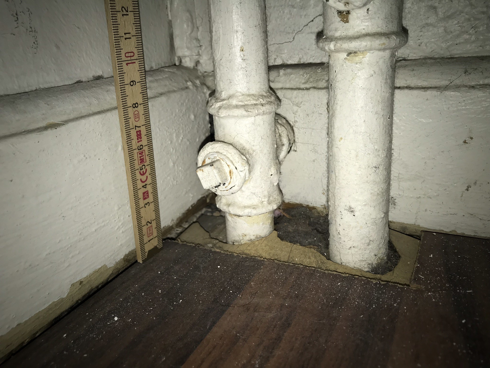 Hantverkare 2: Oj oj, det här kan bli lite jobbigt, Måste ev. gå ner till grannen under för att såga av rören och sätta helgående rör så att kopplingarna hamnar längre upp från golvet.