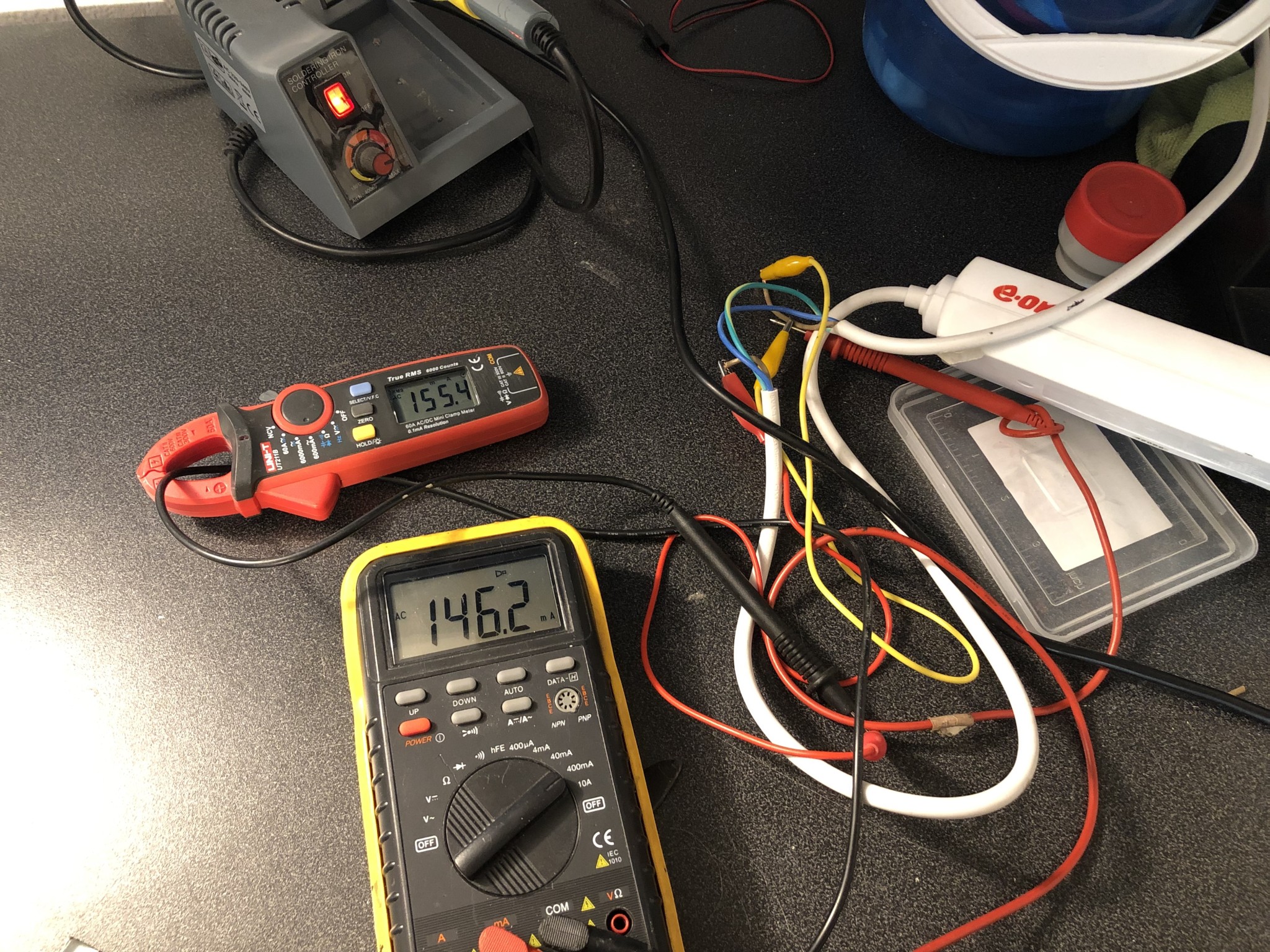Så lägstavärdet är ju lite högt men jag kunde inte enkelt gå lägre (motstånd för 5mA gav för stor effekt i motstånden; flera i serie för att möta spänningsklassingen). Enklast annars hade varit att seriekoppla några glödlampor, men jag har inga med tillräckligt liten effekt och bara två socklar.