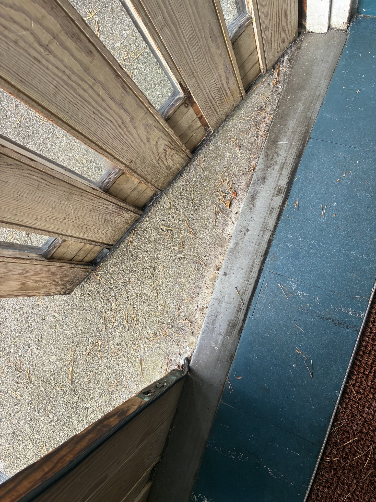 Vid ytterdörren ligger en låg gummitröskel som jag tror monterats för att komma in med rullator. Följden är dock att det inte tätas vidare bra mellan dörr och tröskel.