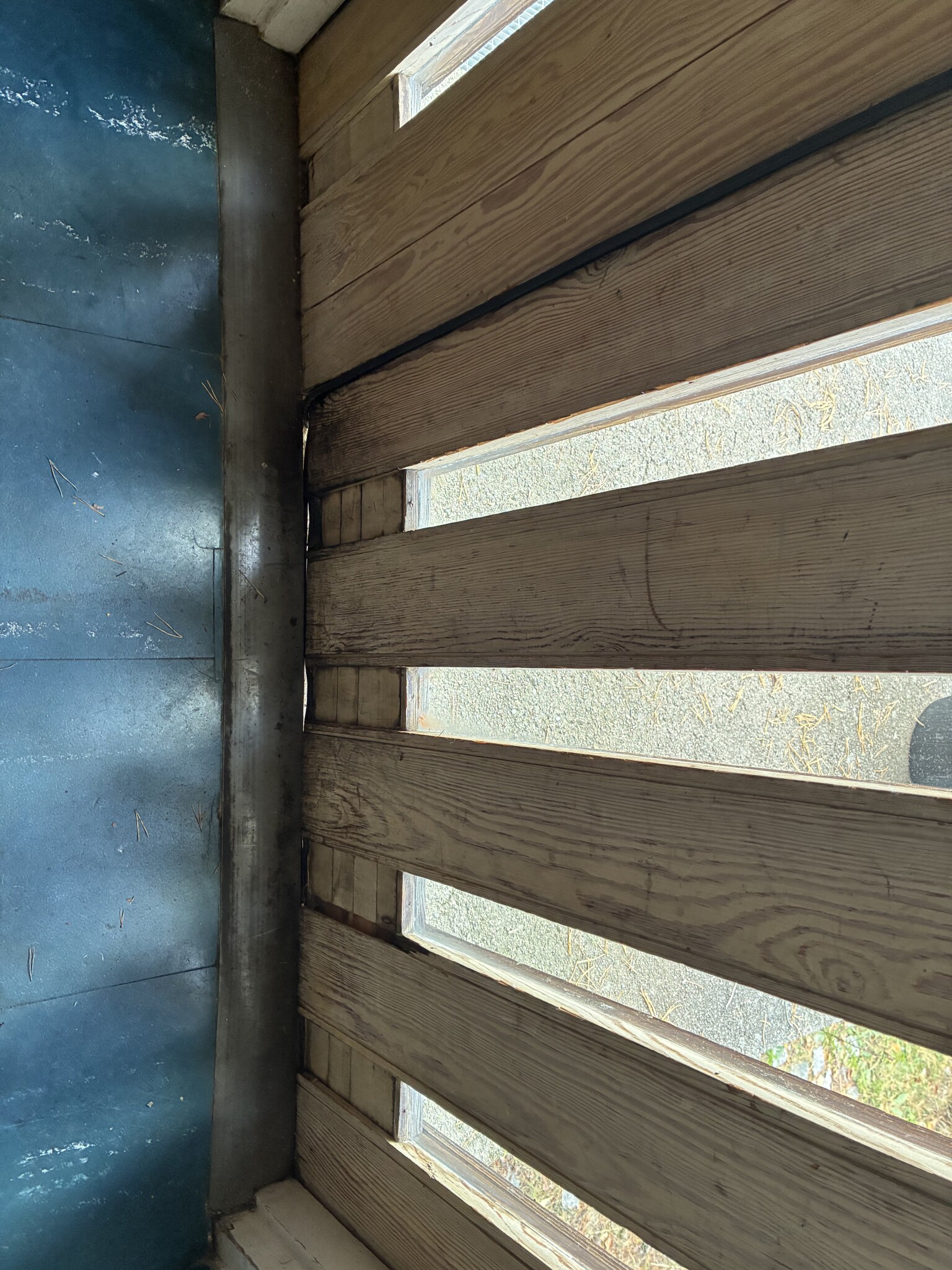 Jag tänker att man får sätta lister horisontellt i nederkant vid de paneler där dörren är smalare. Sedan skulle man vilja ha en stående yta som dörren hamnar mot när den är stängd och på den ytan sätta en list som kan komprimeras ordentligt. Jag tänker att det suttit en tröskel med motsvarande funktion här tidigare men att den demonterats vid något tillfälle. Tror du att det stämmer, eller har det sett ut såhär från början, även om dörren då varit rakare?