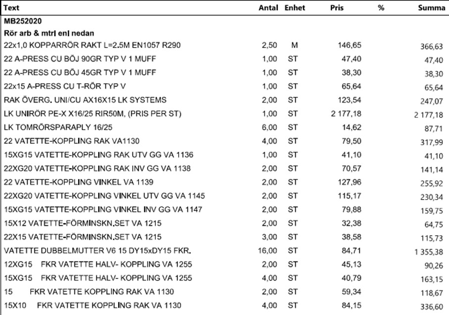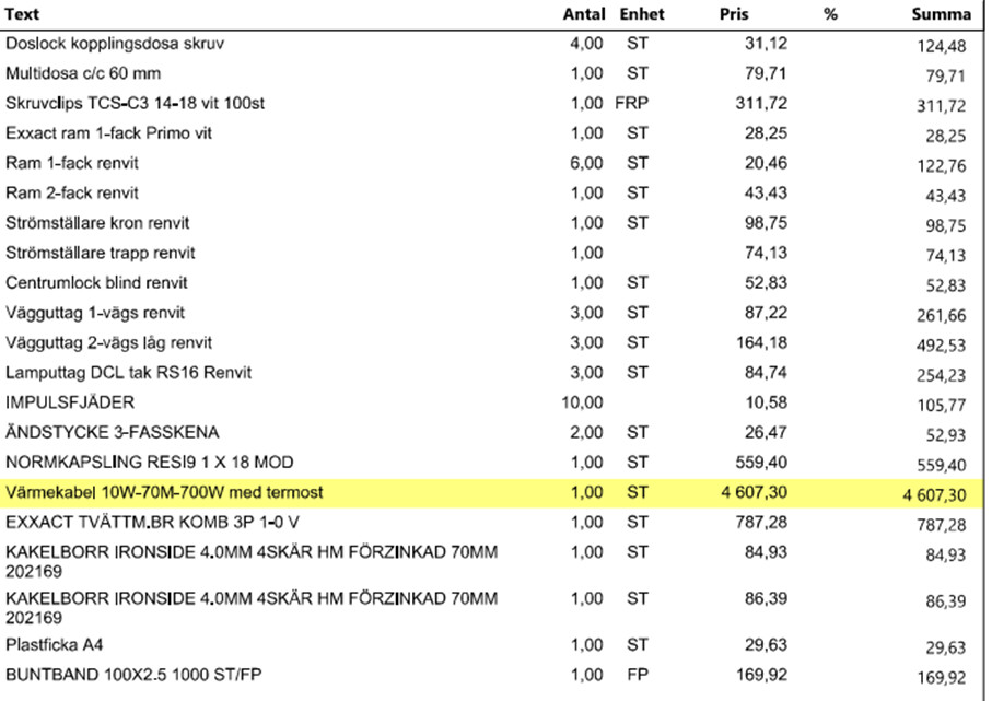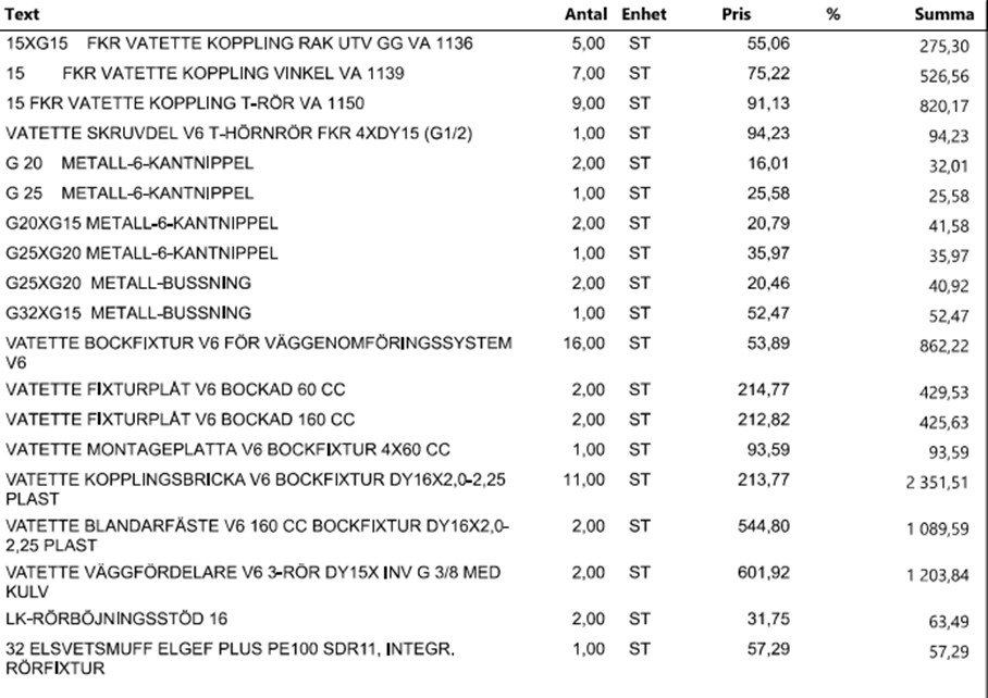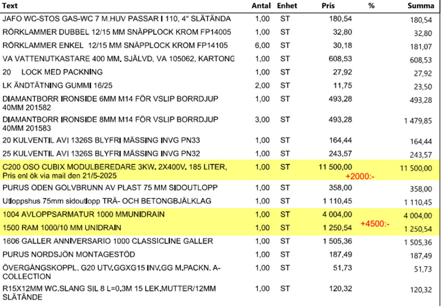 - På VVS-fakturan finns konstiga småposter som 1000stycken buntband, plastfickor, halvpall, gipsskruv, kakel- och diamantborrar och andra småposter som var för sig inte kanske är så mycket men totalt summerar dessa till flera tusen SEK.