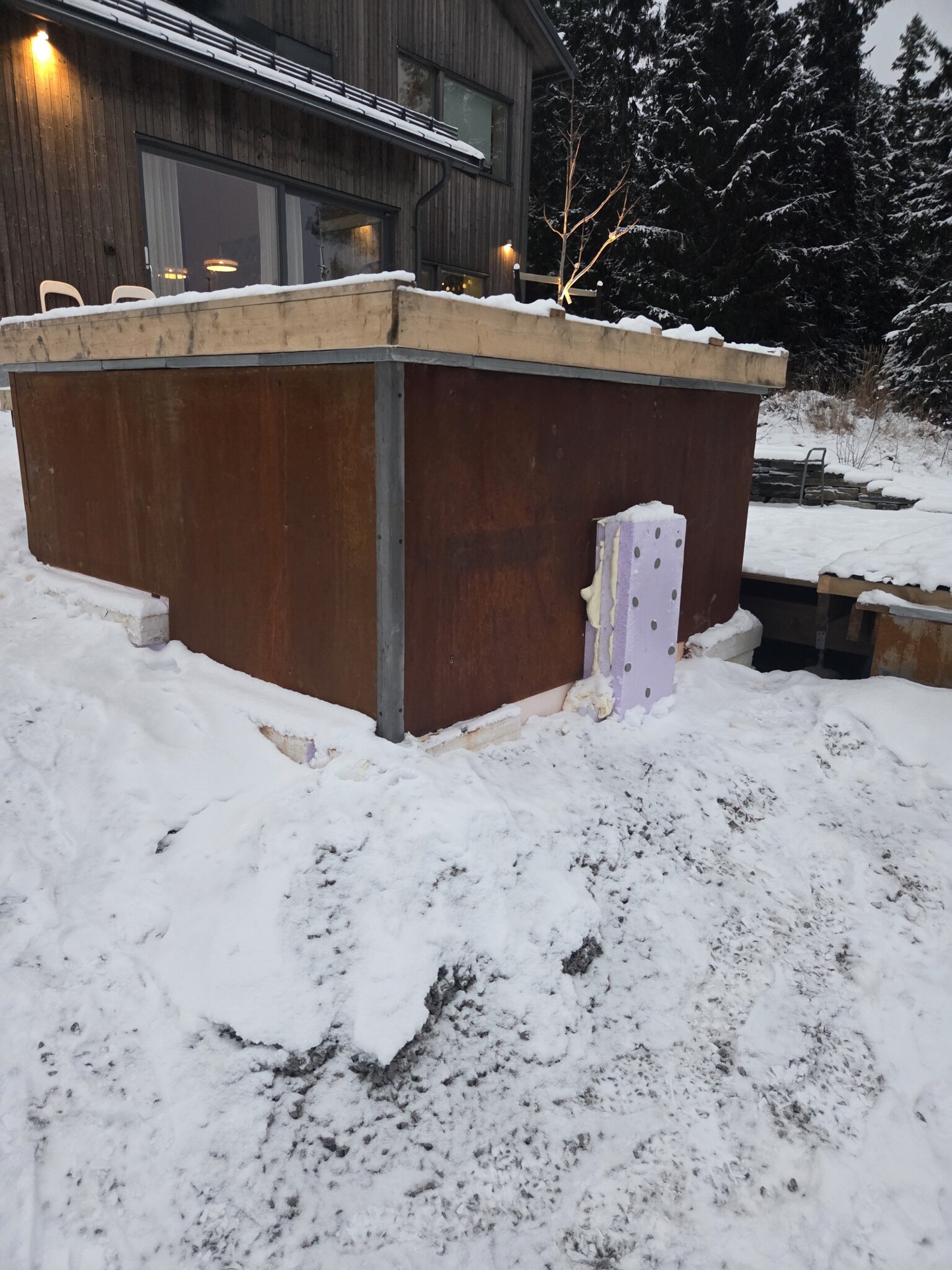 Tyvärr är spalocket med lyft som jag beställde i slutet av sommaren försenat men kommer förhoppningsvis i mitten av december. Tills dess kämpar vi på med mitt provisoriska lock av överbliven cellplast och virke.