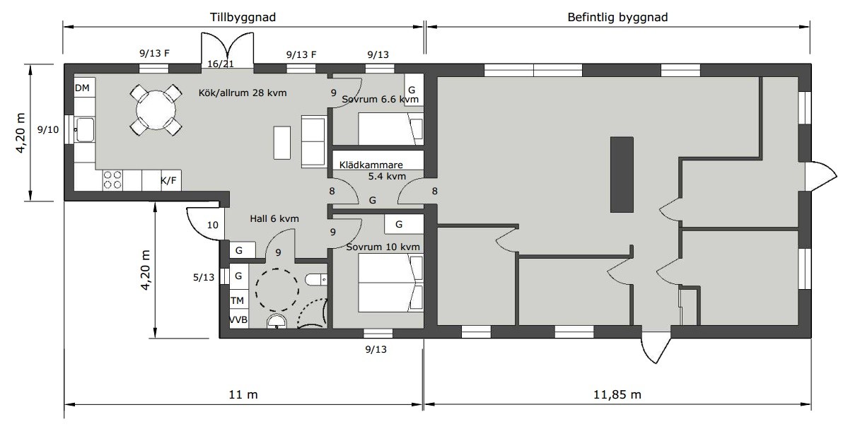 Har lämnat in bygglov för att bygga ut ett befintligt hus (ifrån 1964) med ytterligare ca 60 kvm. Utbyggnaden är tänkt att fungera som en separat bostad. Här är planlösningen jag lämnat in: