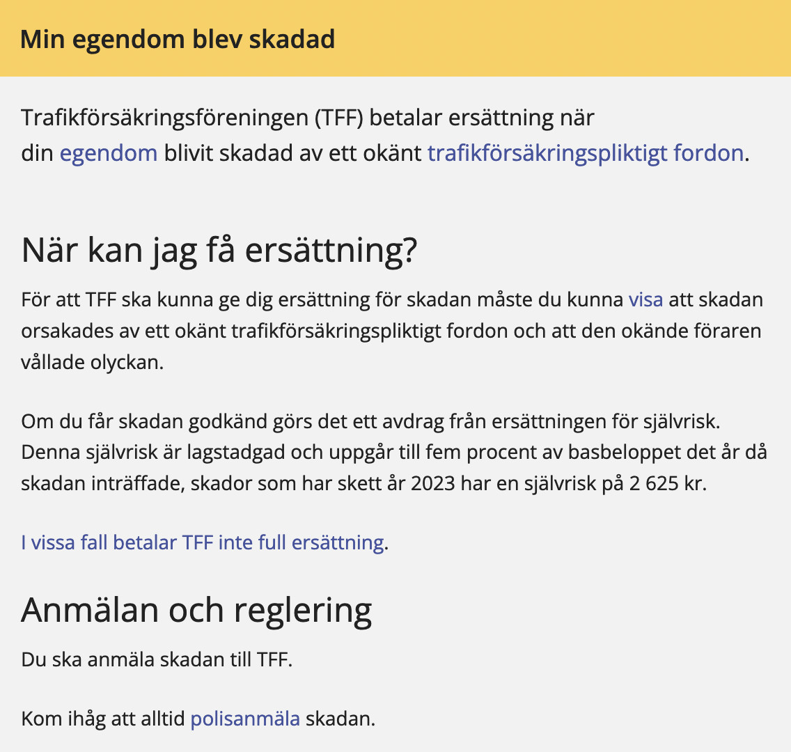 Ja skador orsakade av ett motordrivet fordon är ju lite speciella eftersom trafikskadelagen kickar in så man kan få skadestånd via trafikförsäkring. Som skadelidande har man en valmöjlighet enligt lagen, man kan välja att ta frågan via trafikförsäkringen eller via de vanliga kanalerna och ställa ett skadeståndskrav.