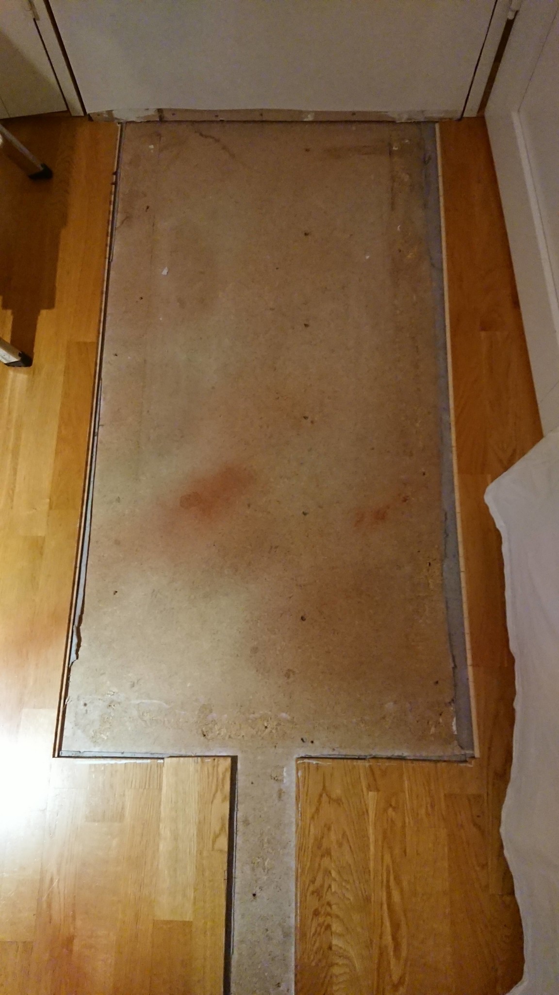 Hej, vi har rivit en vägg och har nu ett större rum där det saknas golv. I de ursprungliga rummen stod garderober under dessa fanns tyvärr inget golv. Det saknas även golv där väggen var.
