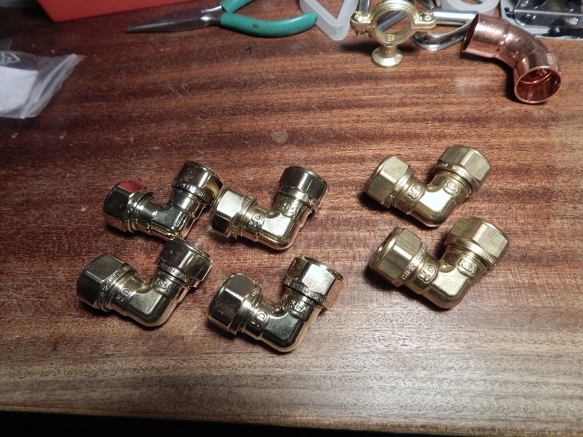 polerat upp mina mässingskopplingar.. Dom 4 till vänster har jag kört lumpskiva på. Jag vill ju inte gå fram med kromade grejer till burken jag gör utan det skall bli lite X-tra. Det blir även mässingshållare för rören, det syns en på bild, den skall också poleras.