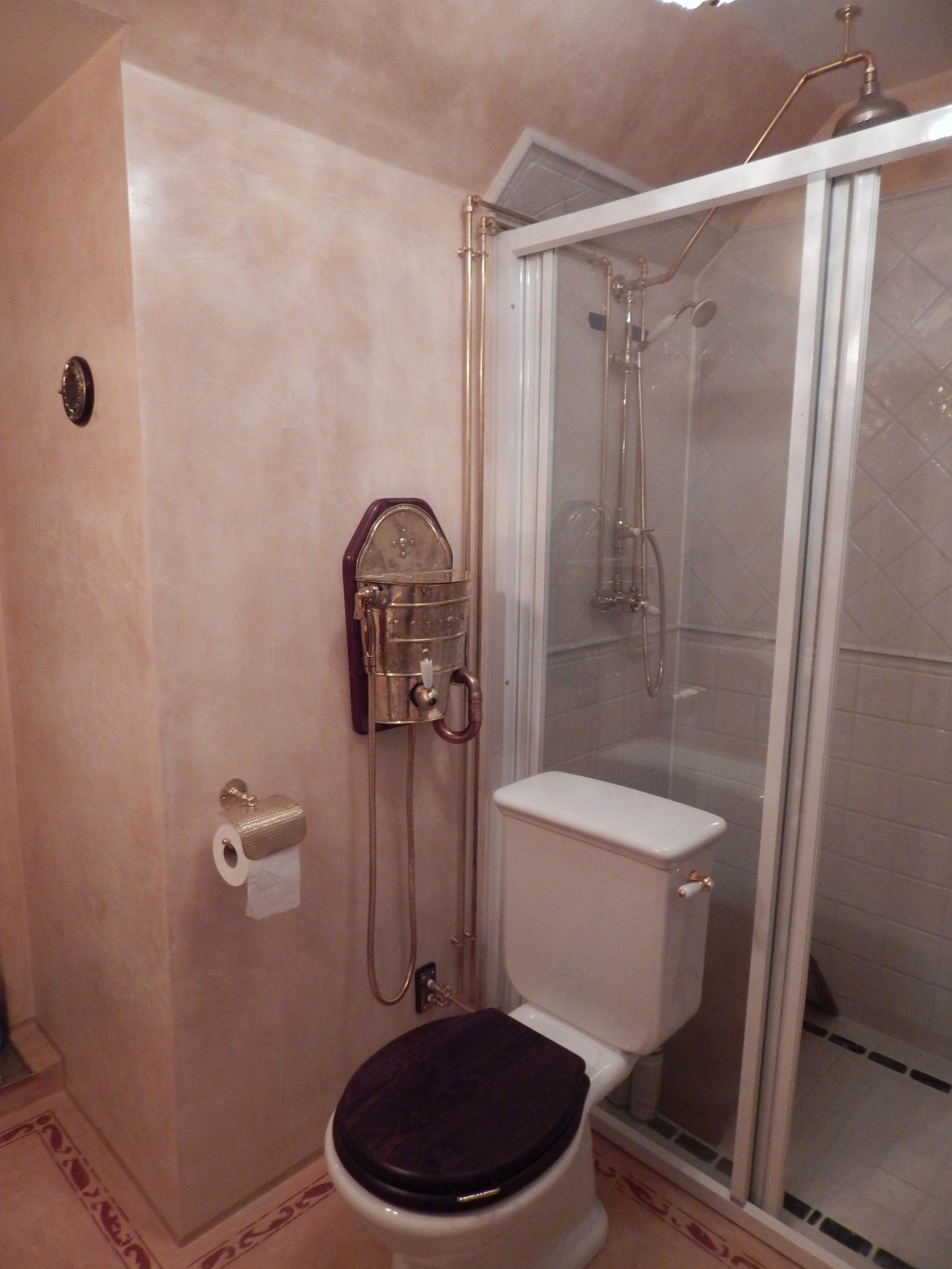 Jag provade att sätta burken på plats. Det blir lite annorlunda. Den är inte inkopplad ännu men inom en snar framtid bör det vara klart. Bidé dusch lite special.. Skall kopplas in på rören till duschen, jag köpte mässingsrör jag blev tvungen att ta några lödskarvar i koppar till takduschen. Väggar och golv är kalkputsade, creatina heter det.