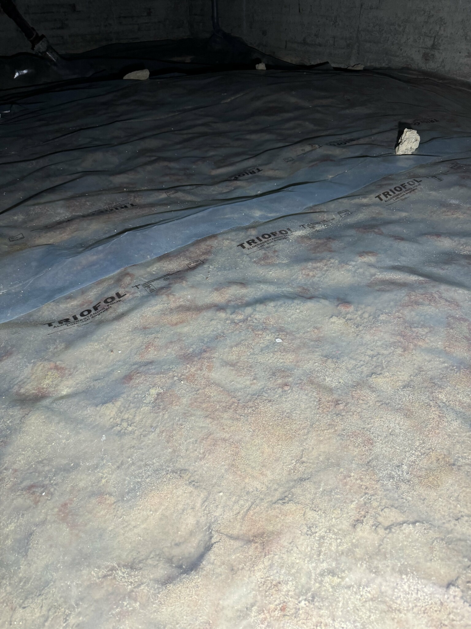 Det verkar finnas ett mikrobiellt angrepp under byggplasten mot marken i krypgrunden. Det kan avge lukt, särskilt eftersom byggplast inte är helt tät emot dessa ämnen. Som allra bäst tas byggplasten bort och markmaterial som är angripet grävs ut, alternativt behandlas med saneringsvätska. Efter behandlingen strös rikligt med vägsalt ut över markytan, ca. 6kg per 10m2 markyta. Detta räfsas ned i markmaterialet för att få så god kontakt som möjligt ett antal cm ned. Om markmaterial grävs ut så är det bra innan ny byggplast läggs, att strö vägsalt. Då räcker det med 3-4kg per 10m2 markyta.