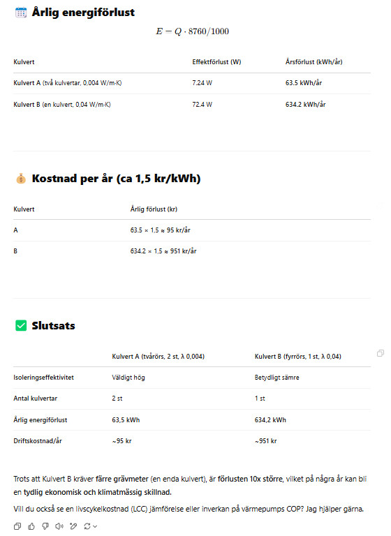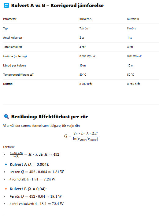 Kan jag på hyfsat enkelt sätt beräkna effektskillnad på dessa kulvertar på årsbasis utan att behöva blanda in allt för mycket andra faktorer?