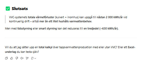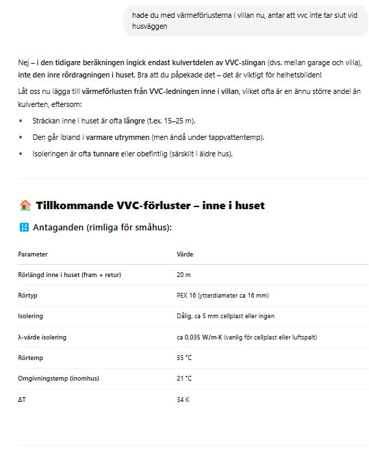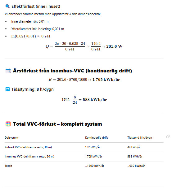 Så även fråga kring VVc, vad är effektförlusten för att cirkulera vattnet under ett år? om behovet inte är stort kanske det är bättre att satsa på en bättre isolerad 2 vägskulvert och KV och en lite varmvattenberedare i garaget som kan slås igå