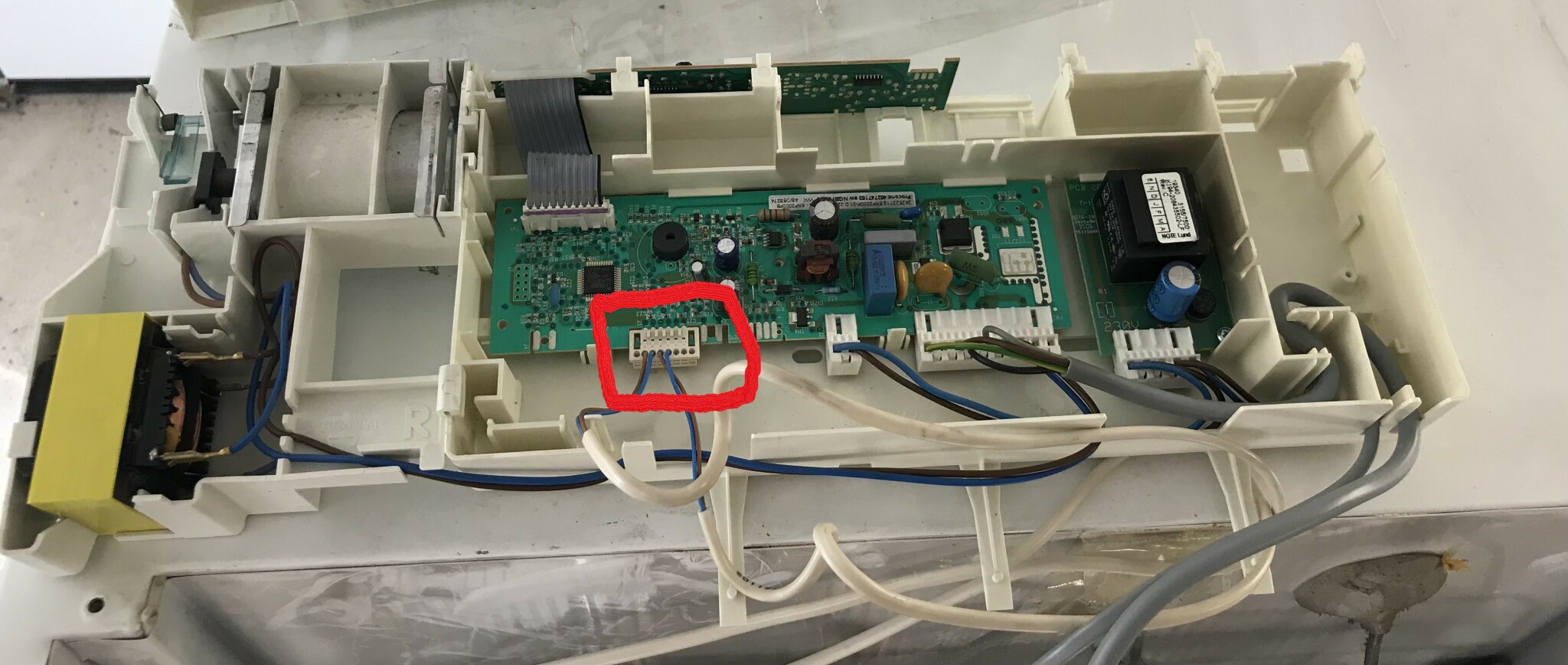 Har inte lossat någon kontakt, åtminstone vad jag vet. På kretskortet har jag försökt lätt trycka på alla kontakter, ingen skillnad. Har nu gått med en spänningsdetektor och det är på den som är rödmarkerad på bilden och tillhörande kablar det inte ger något utslag. Kablarna från den går in på två olika ställen i kylskåpet (de vita kablarna).