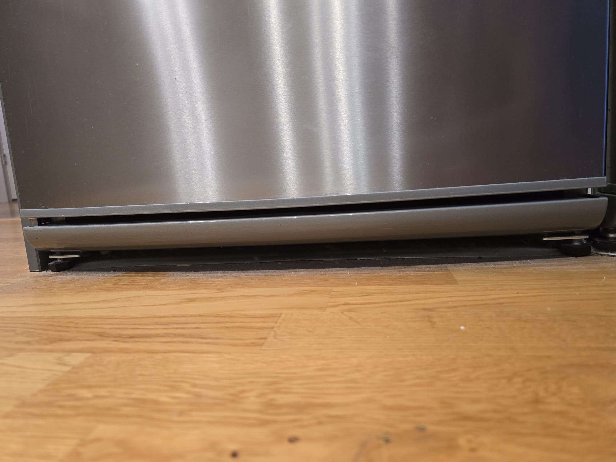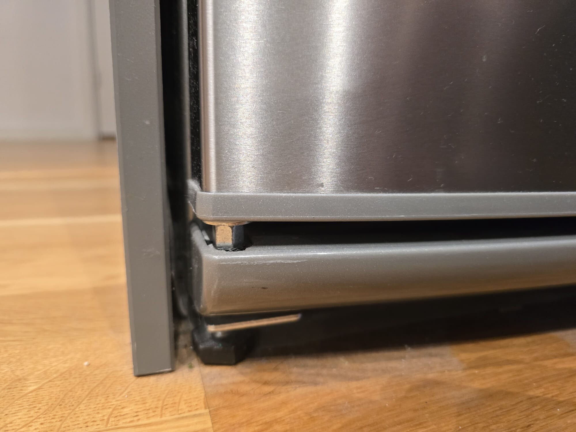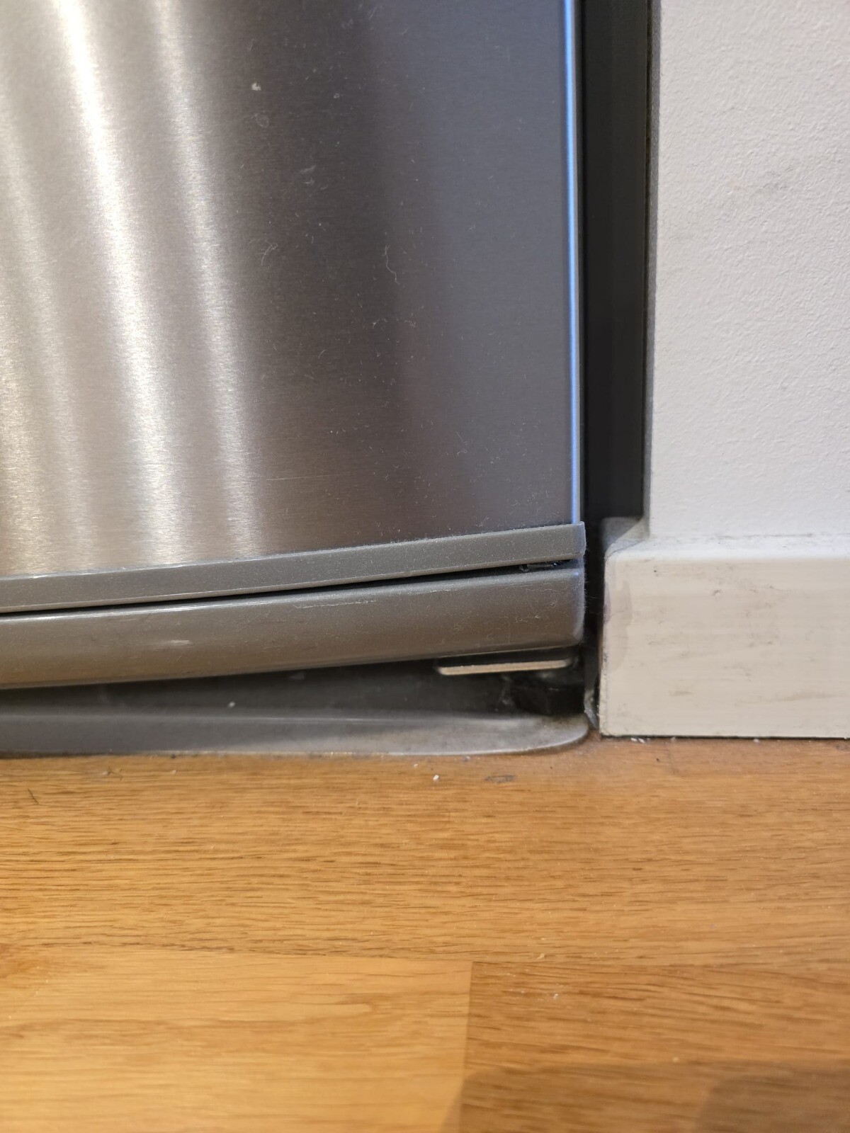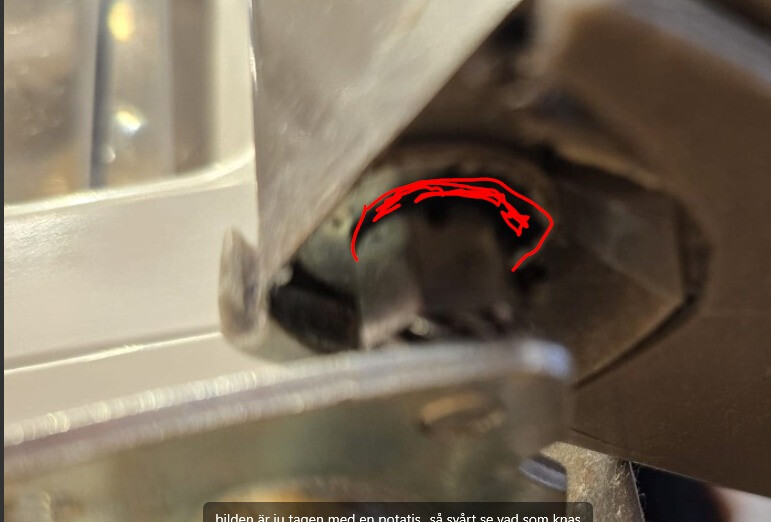 Sedan några veckor har vi märkt att dörr inte stängs auto, man måste trycka annars stängs den aldrig. Ser man bilderna jag tagit så verkar gångjärn ha problem, men går det att fixa detta själv? Verkar som dörren gått ner och svalt muttern på något sätt. Vsiar bilder på kylen och där ser man att muttern ska ju vara synligare.
