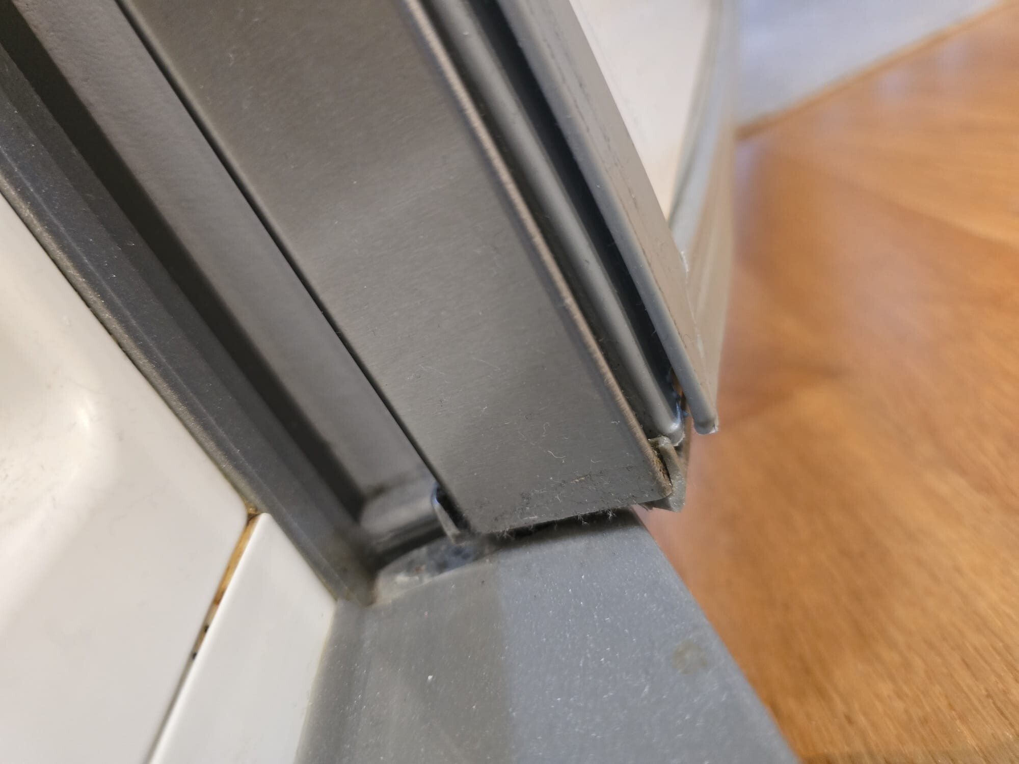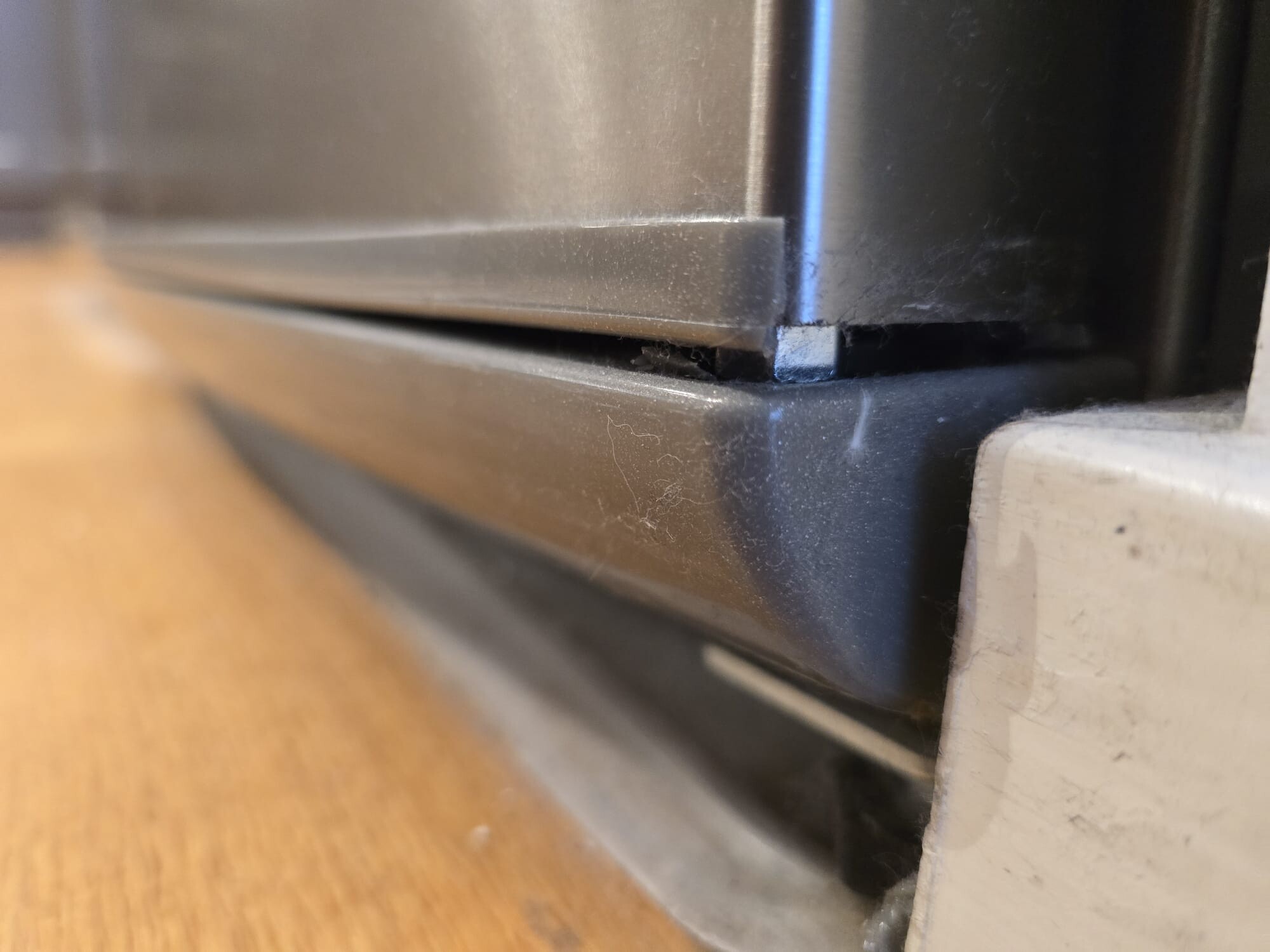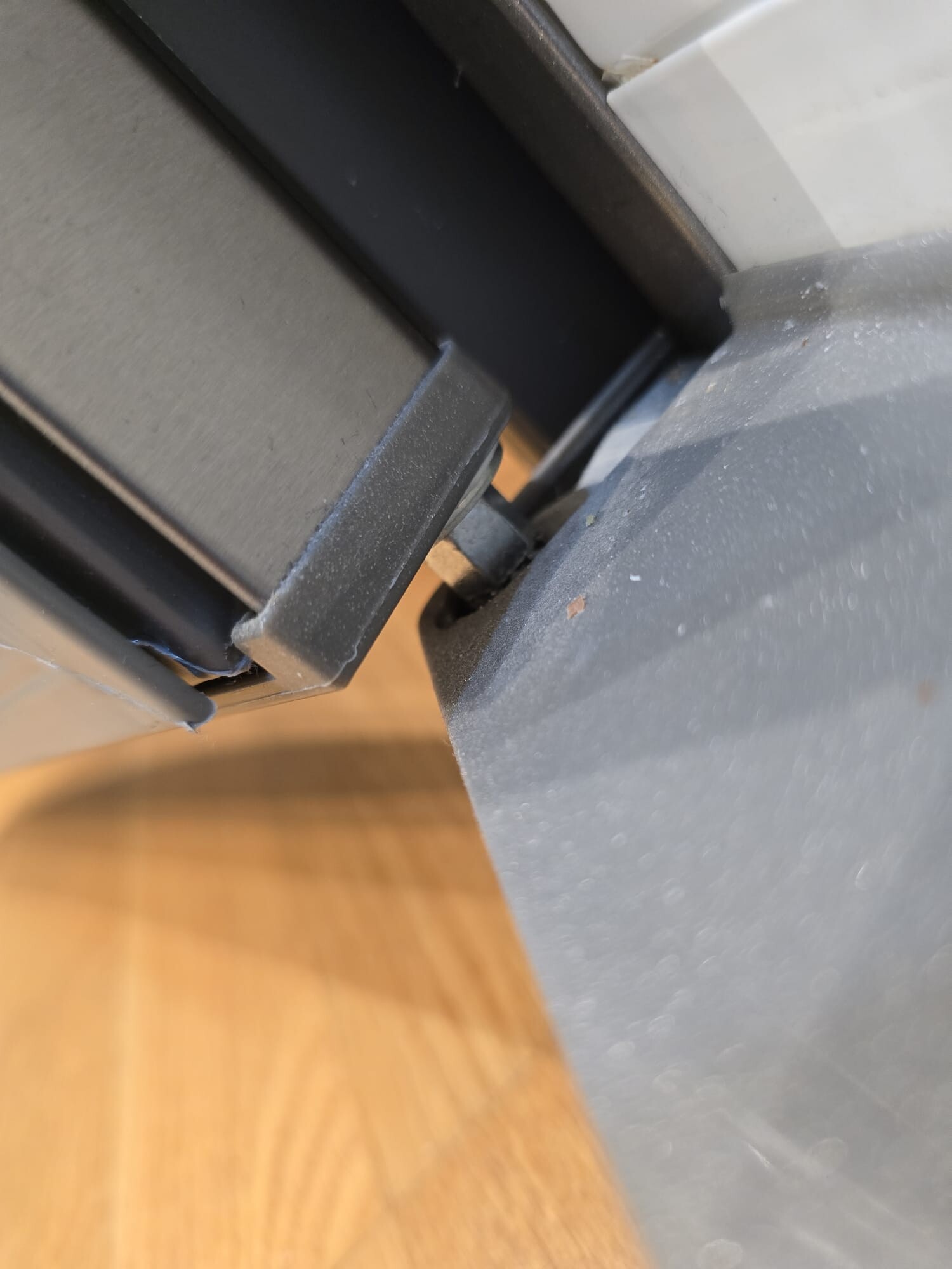 Sedan några veckor har vi märkt att dörr inte stängs auto, man måste trycka annars stängs den aldrig. Ser man bilderna jag tagit så verkar gångjärn ha problem, men går det att fixa detta själv? Verkar som dörren gått ner och svalt muttern på något sätt. Vsiar bilder på kylen och där ser man att muttern ska ju vara synligare.