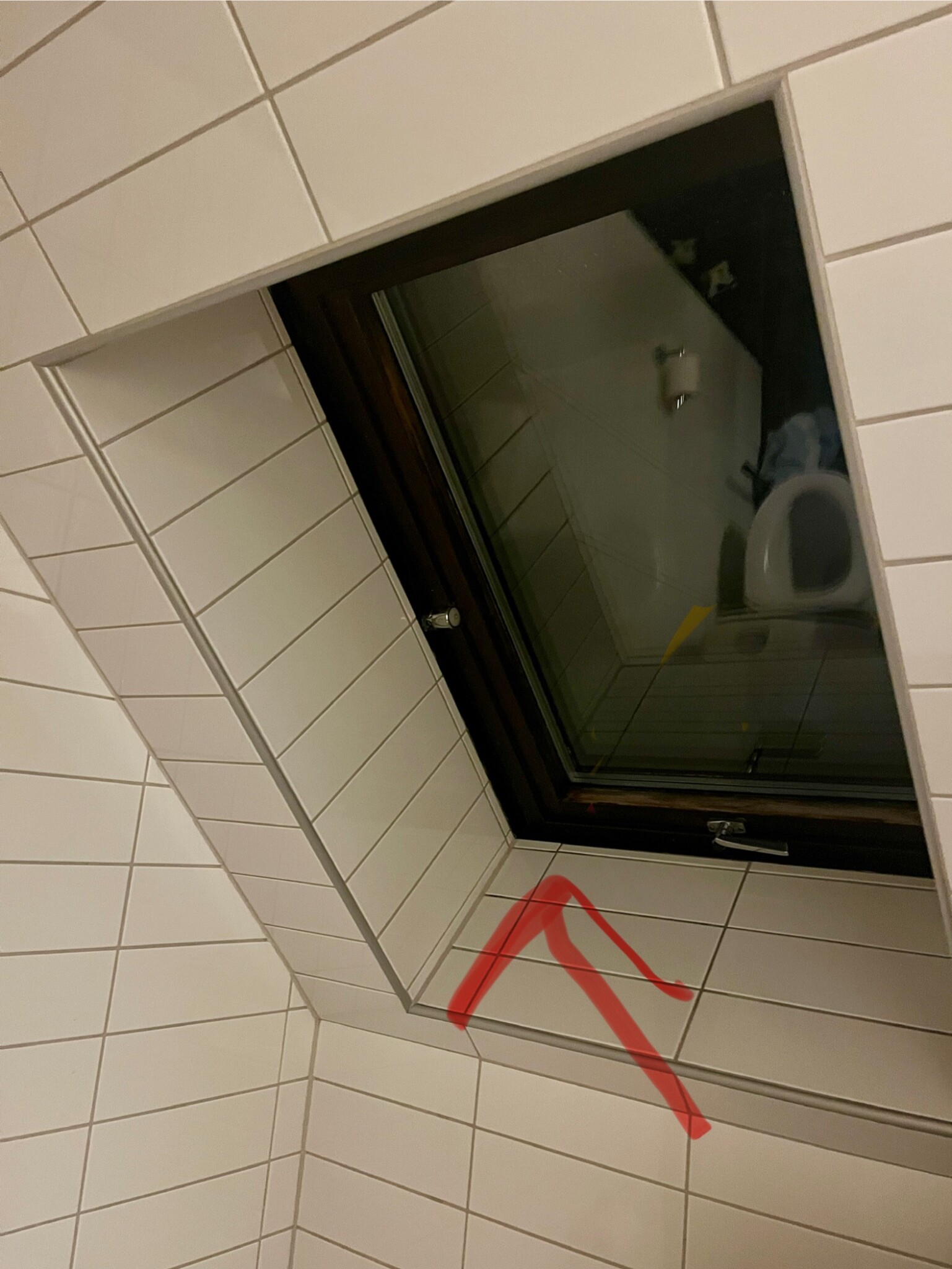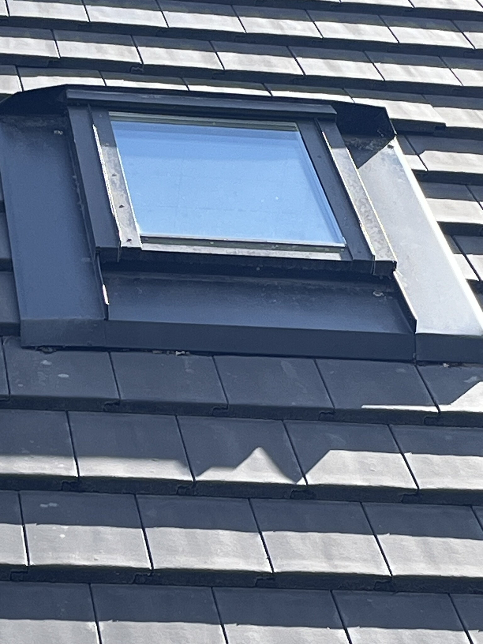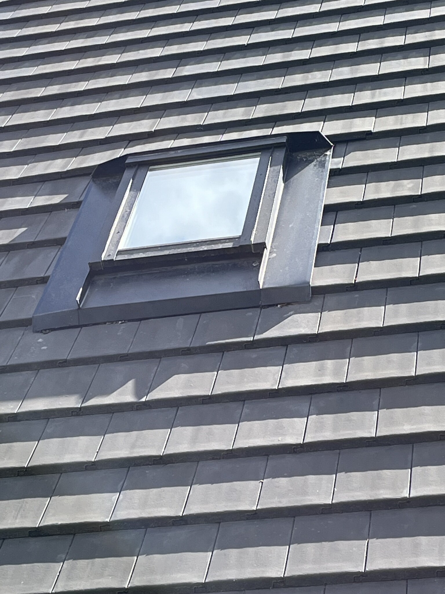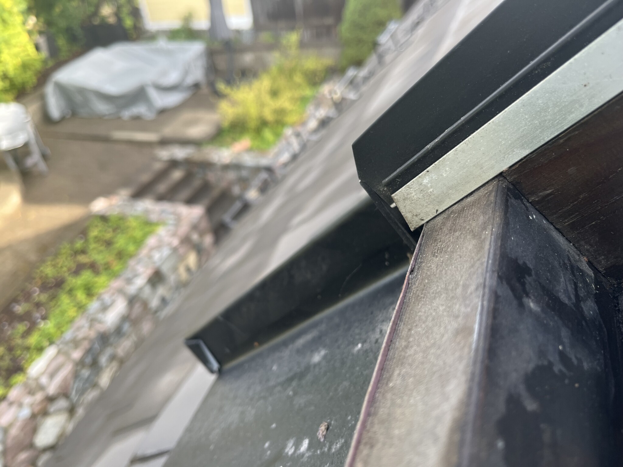Typiskt har fönstret dräneringsspår som skall leda vattnet runt fönstret och ut på taket igen, dessa skyddas normalt sett av en plåttak som sitter fast på fönstret (det finns olika konstruktioner naturligtvis). Min misstanke är att det ligger skräp i dränerings spåren som gör att vattnet inte leds runt fönstret utan kommer in mellan karm och fönster. Öppna fönstret istället dig på en trappstege och se till att det är rent runt om.