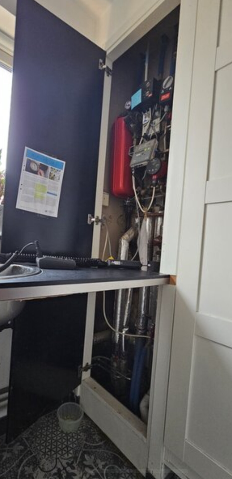Fjärrvärmesystemet är monterat mot ytterväggen i hörnan av tvättstugan med en liten vägg på ena sidan och ytterväggen av huset på andra sidan och en helt vanlig skåpslucka som döljer systemet.