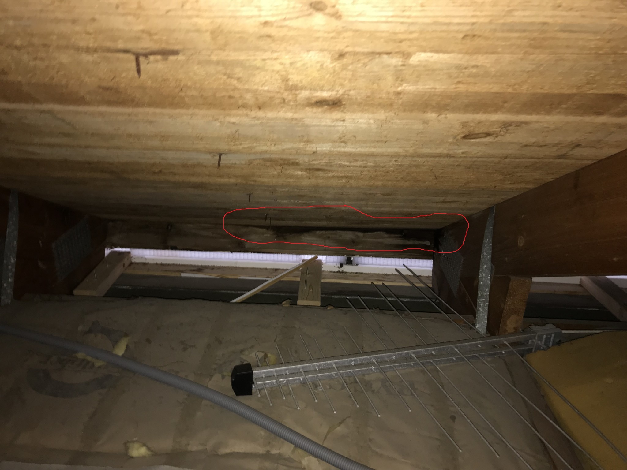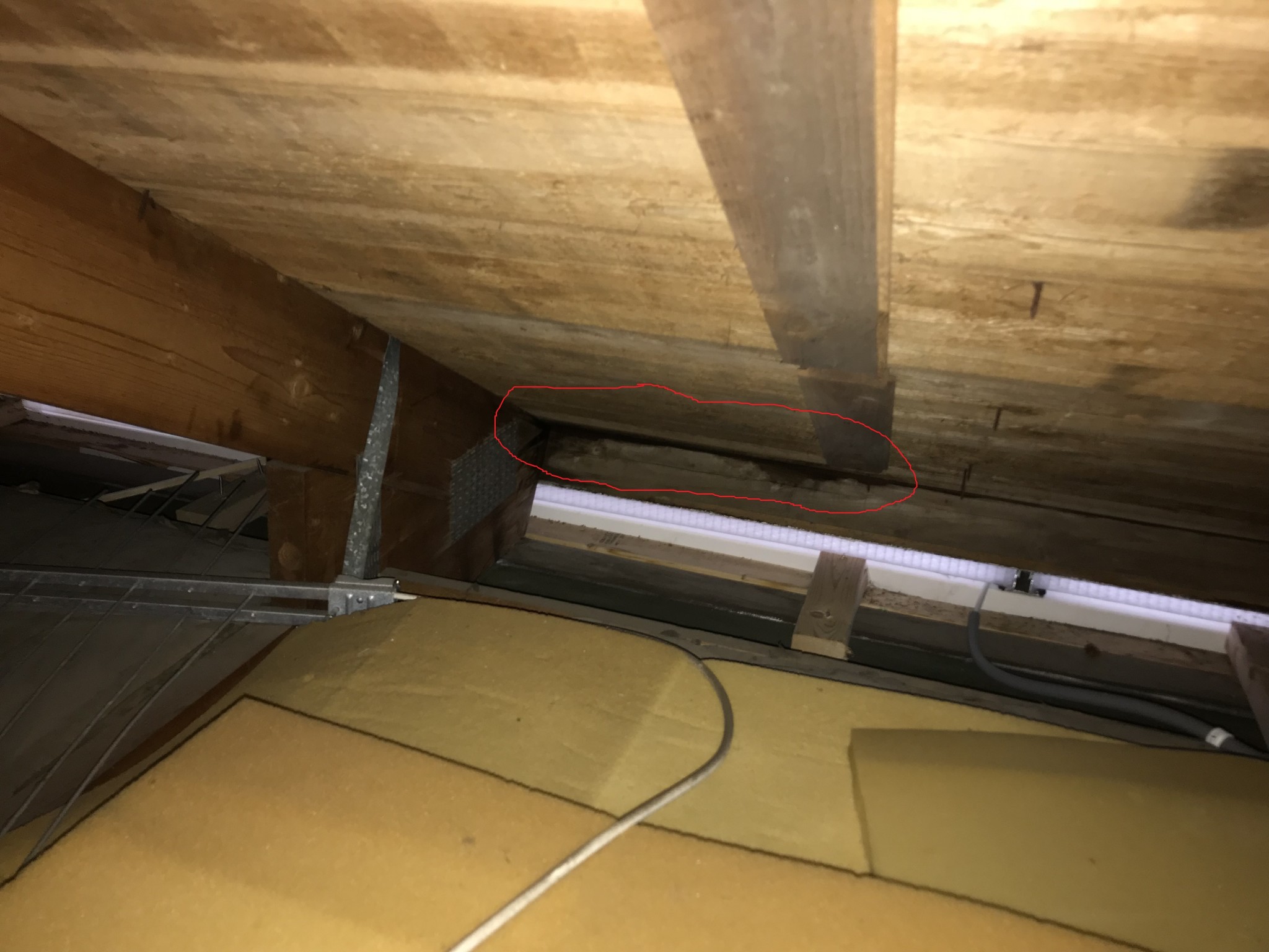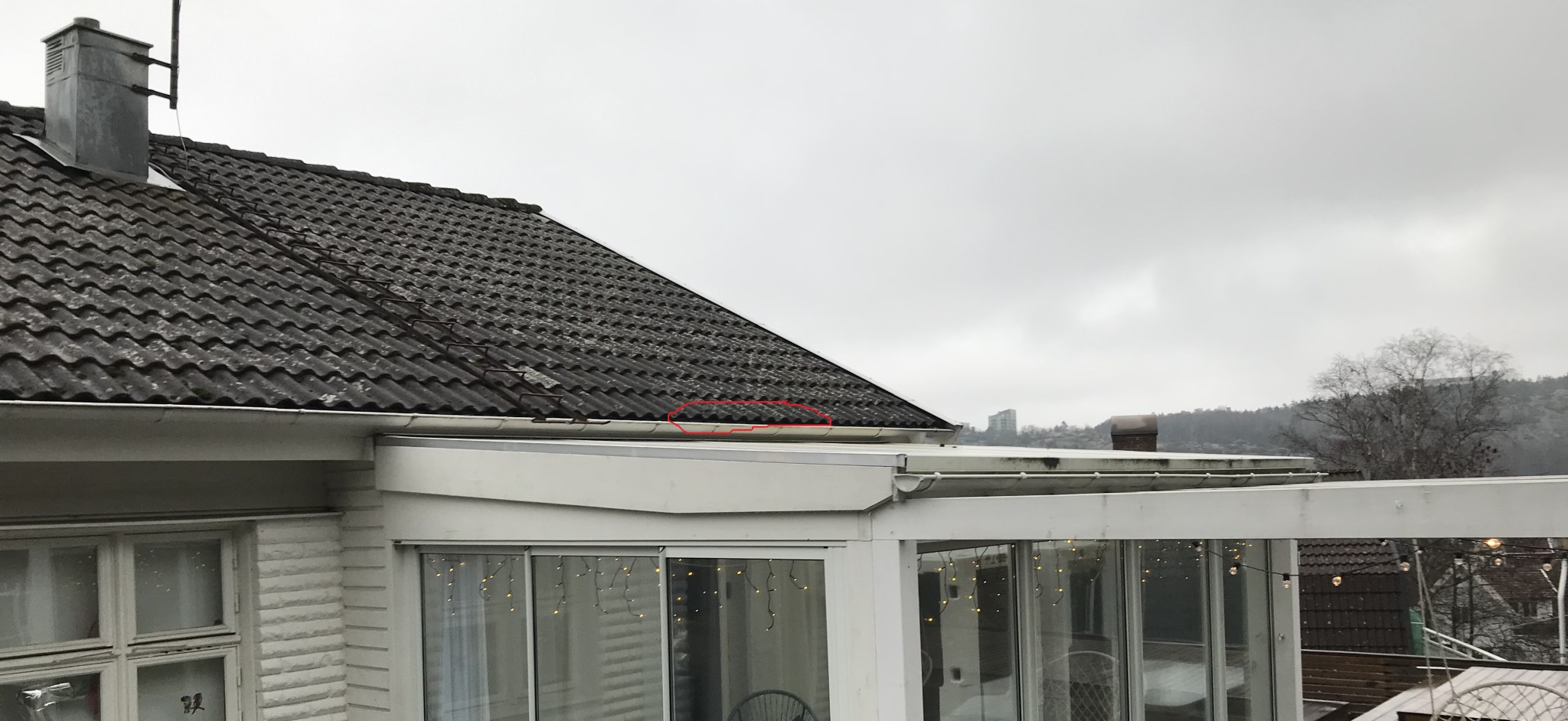 Jag märkte att det började droppa i närheten av innerväggen i uterummet. Gick upp på vinden och såg att det var fuktigt längst ut. Se tre bilder nedan, där fukten är inringad i rött.