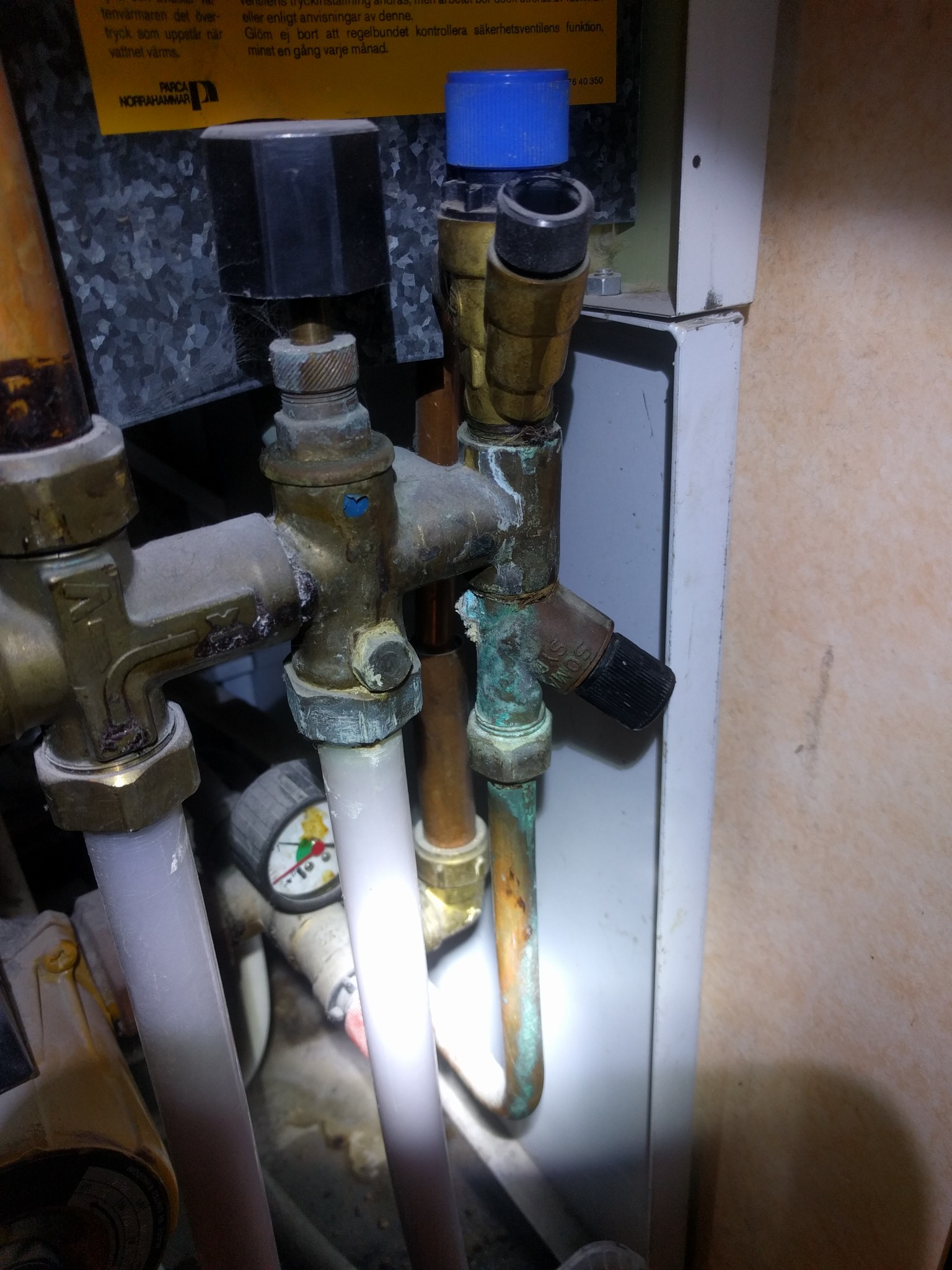 Jag har motionerat båda säkerhetsventilerna ordentligt men jag är fundersam på om jag eventuellt kan ha ett litet kvarvarande läckage i den som tillhör värmen (syns svagt rött bakom ena röret) eftersom trycket sjunkit väldigt sakta efter att jag startat upp det igen. Den är precis som den blå för VVB öppningsbar och det står till och med på klisterlapparna att man kan öppna och rengöra dem. Är det något som är värt att göra eller brukar det bara vara att be om mer problem på saker från 1980?