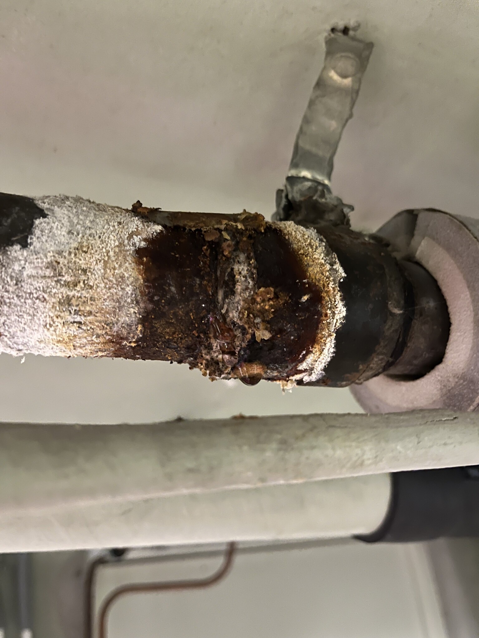 Ringde dem och det blev ett jävla pådrag med jourbil och rörmockare inom några timmar. Rörisen drog bort lite mer isolering och blottade mer riktigt risigt rör (se bild nedan), men bakom "orginalläckan" finns kanske 2-3 m till isolerat rör som går igenom väggen och fortsätter in i ett badrum där taket är täckt med bräder (jag kan alltså inte se rören där).