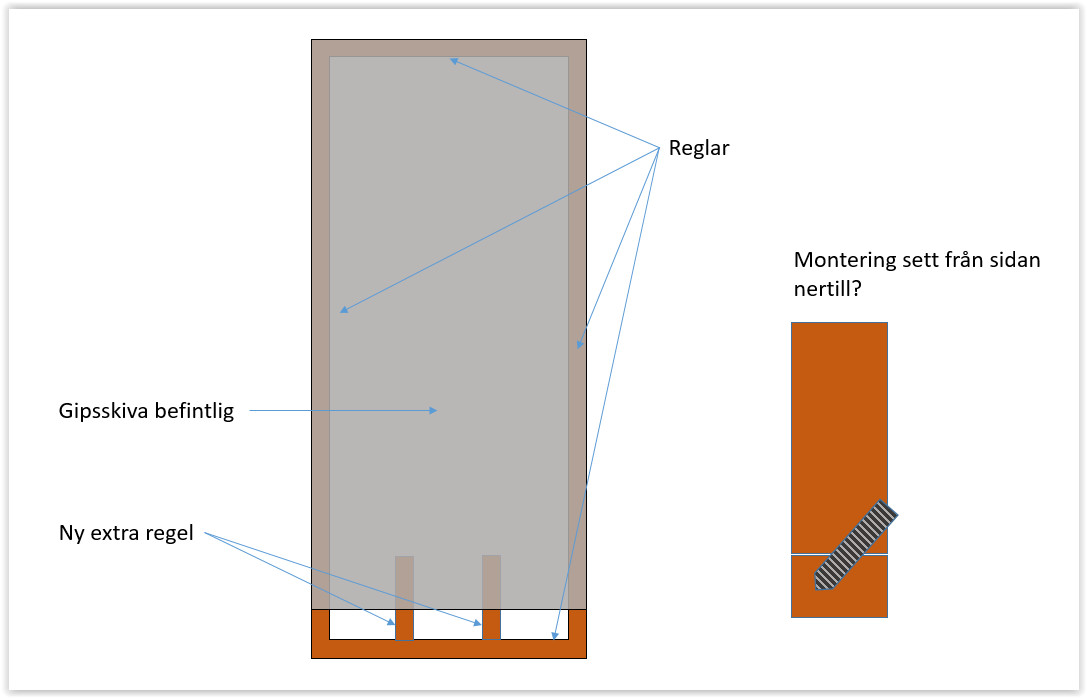 Men det är inte alla ställen där jag enkelt kan lägga till en bit regel på insidan. Som t.ex. här. Betyder det att jag måste öppna gipssivan för att få in regelbiten bakom? Finns det inget sätt att åstadkomma samma sak "utifrån" så att säga?