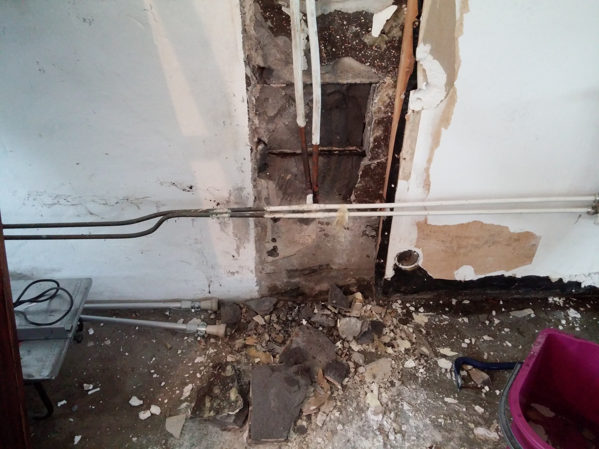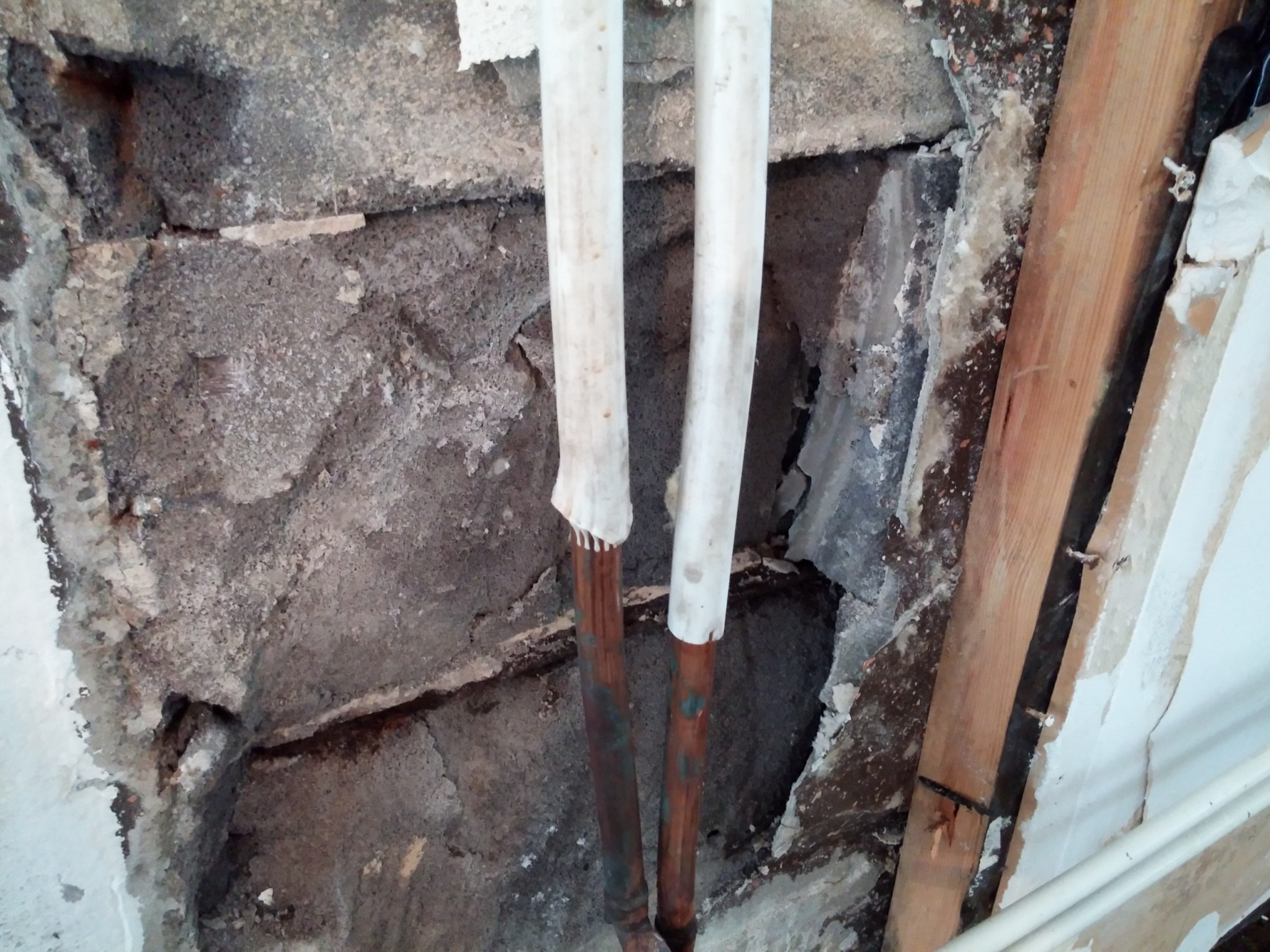 Laga upp väggen med cementbaserat spackel eller betong/puts.