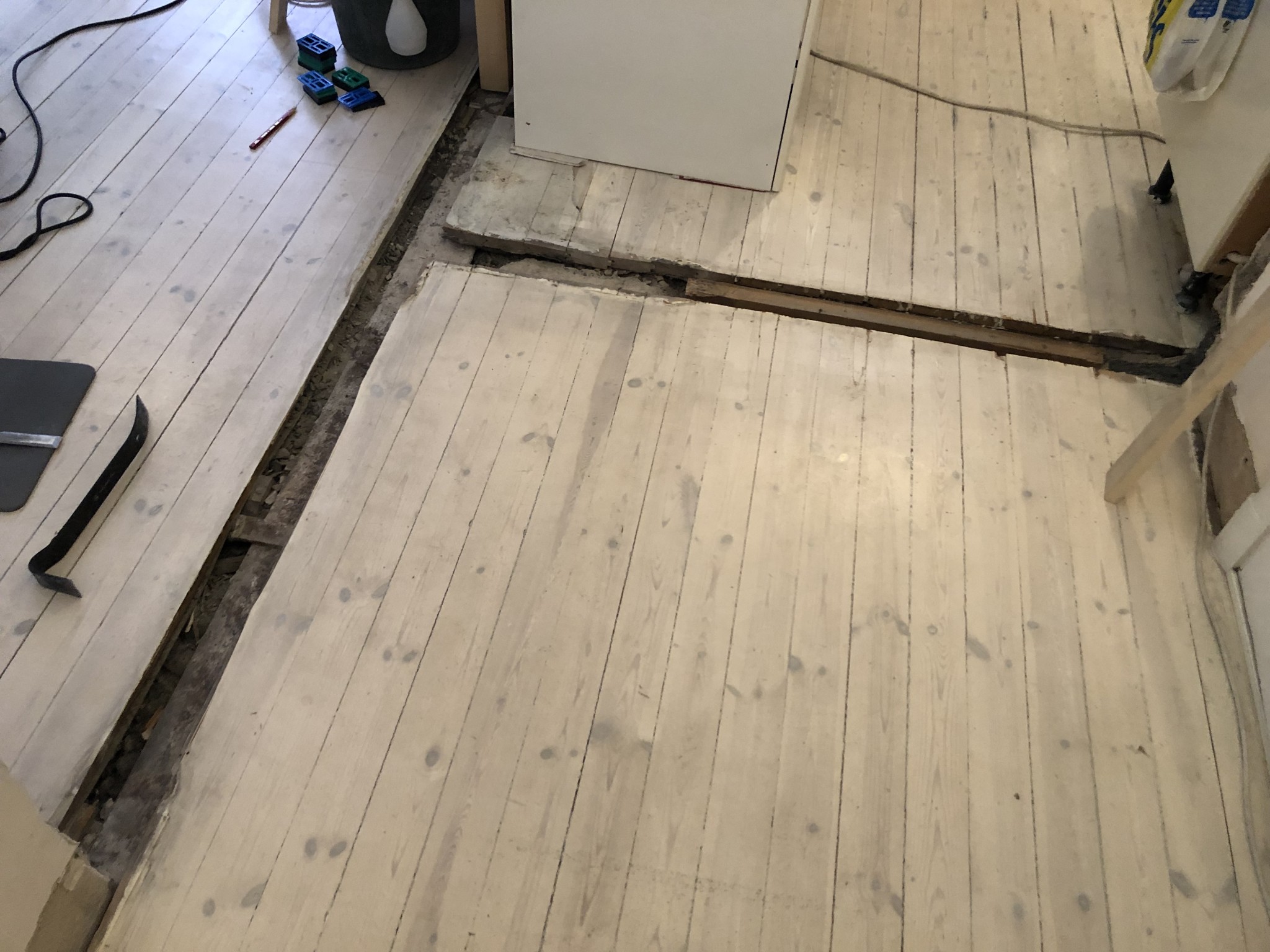 Har varit inne på att fräsa spår i golv och nya plankor, cirkelsåga rakt etc men får inte ihop arbetsflödet i mitt huvud vad som är klokast.