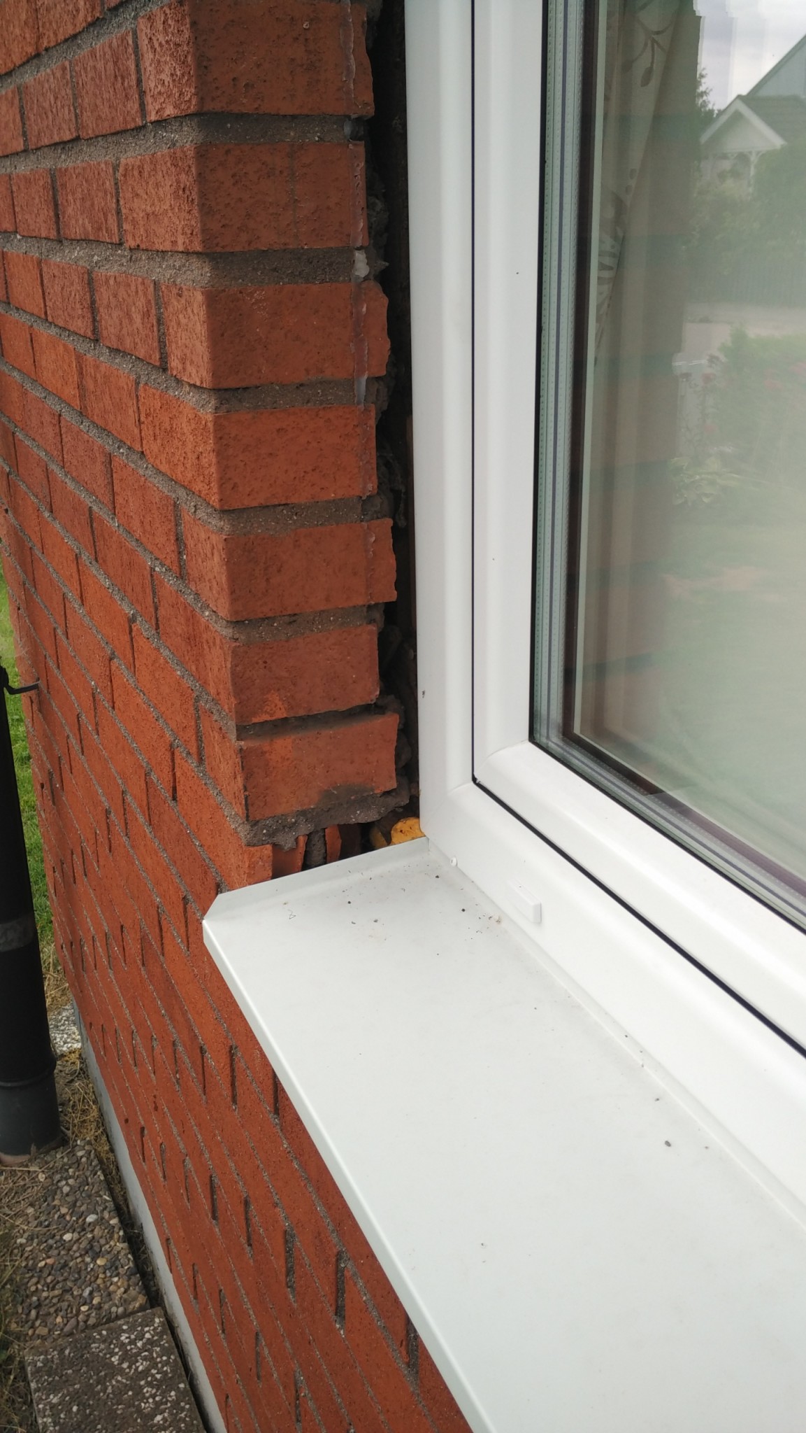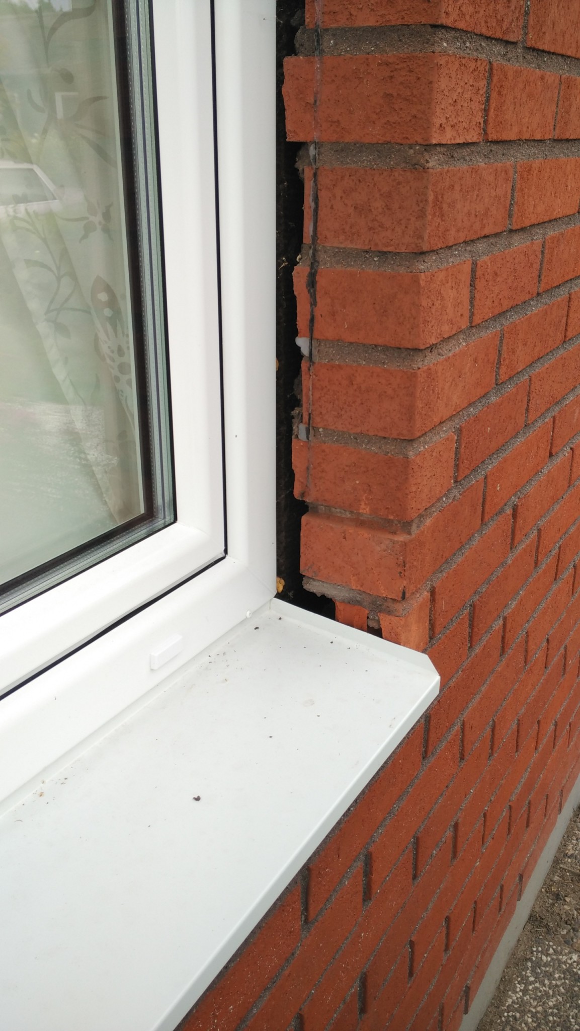 Den nedersta tegelbiten var jag tvungen att kapa, därför så har den gått sönder. Tänkte sen sätta en list hela vägen som täcker öppningen (en sån fanns även när orginalfönstret var monterat).