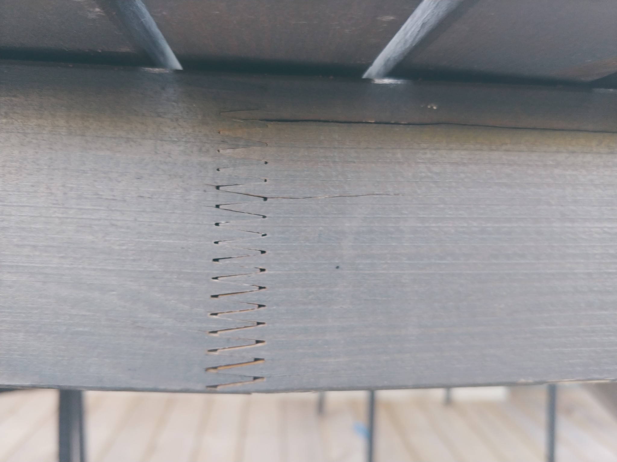 Du har fingerskarvat virke i bordet där limningen uppenbarligen är dålig så att bitarna släpper från varandra. Det ser ut som att den inte klarar ngn nämnvärd belastning alls nu.