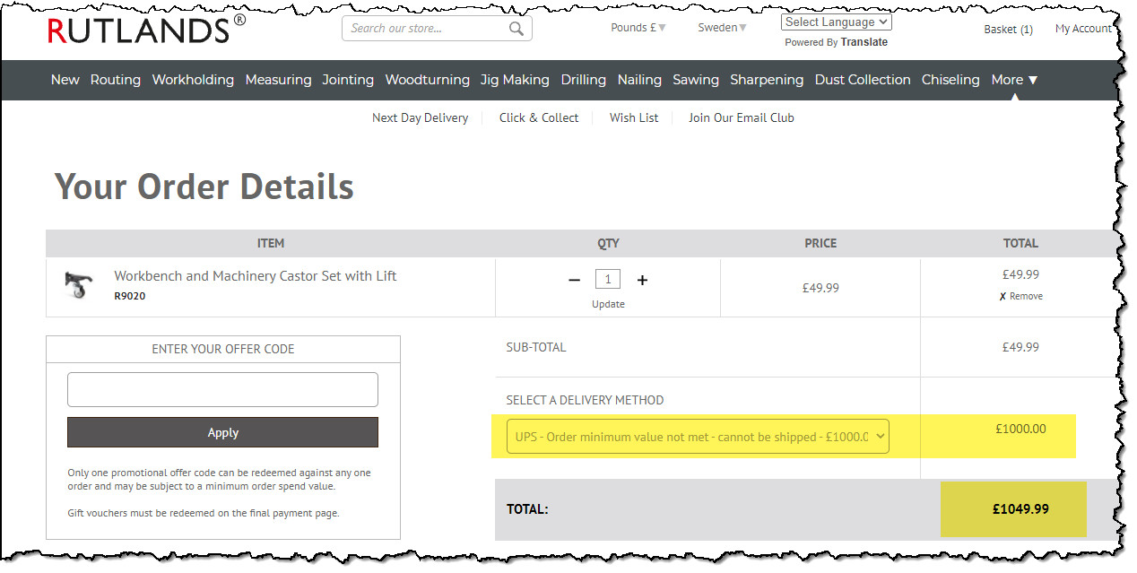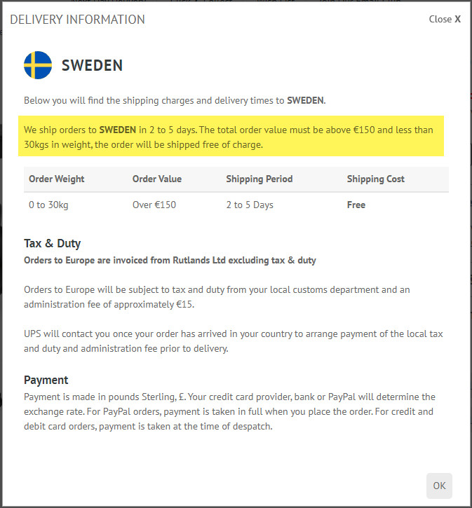 Om jag fattar det rätt måste beställningen överstiga 150£ för att de skall sälja nåt till Sverige...