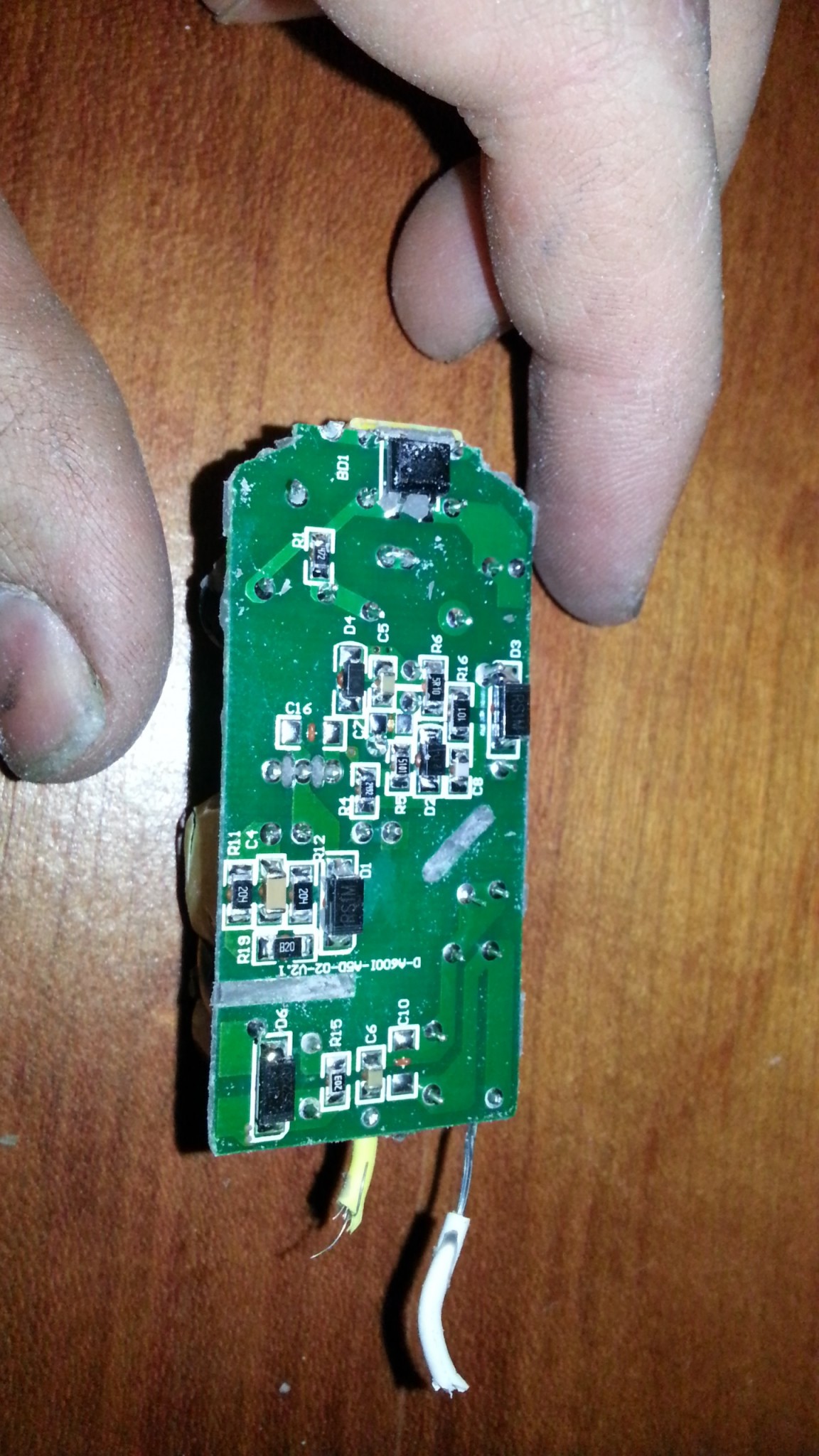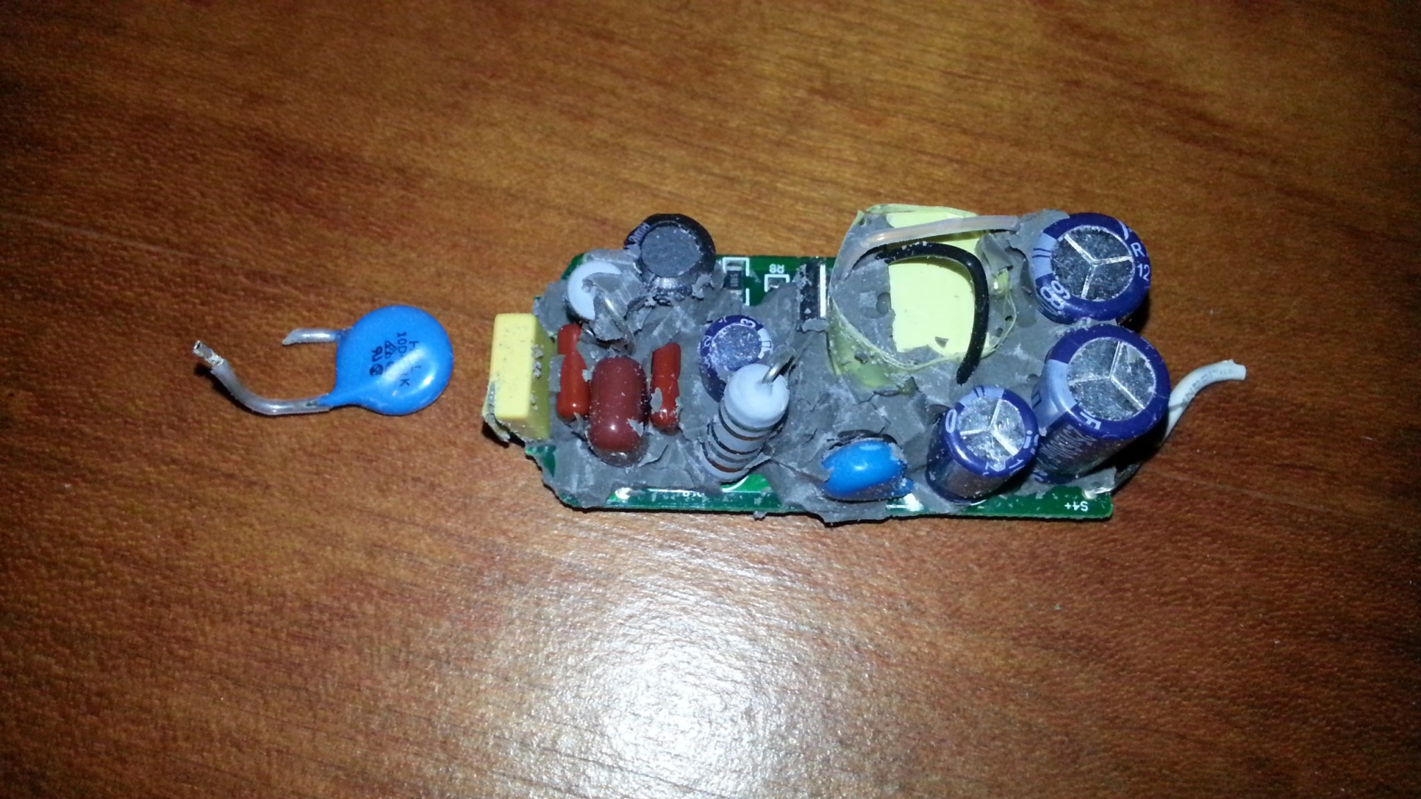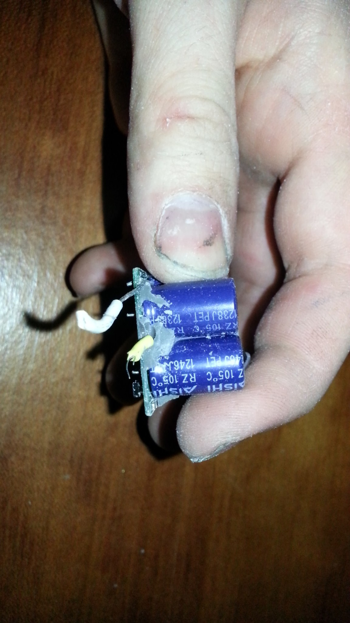 ser inte ut som någon kondisator gått sönder. Det gula lägst till vänster är där strömmen går in (den plus den blå kondisatorn tar hand om 230 volt), den större gula mer runda växlar om strömmen ner till passande volt, alla kondensatorer tar hand om rippel, samt fungerar som batteri (laddar upp för att kunna ge rätt spänning hela tiden).