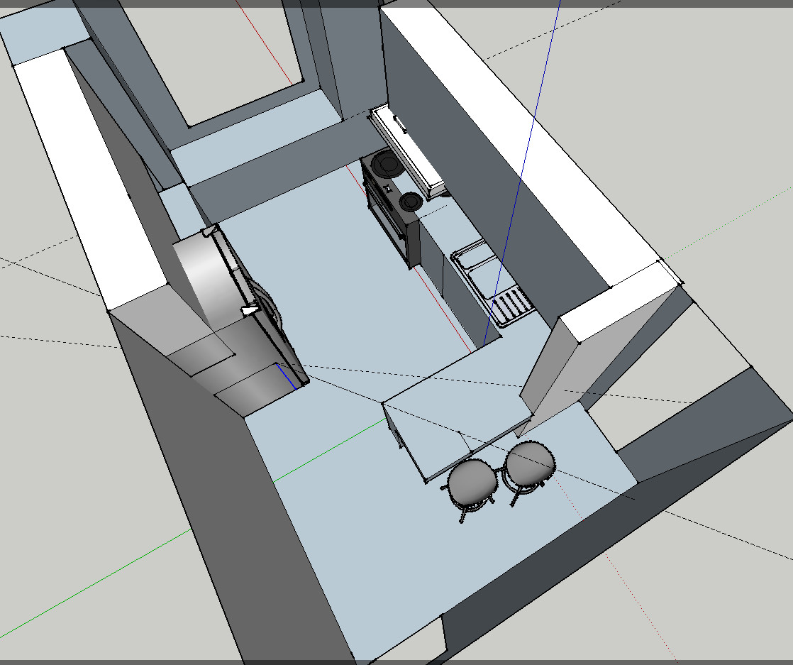 Hej gänget! Jag hängde här med min förra fru när vi skulle köpa hus. Nu är bor jag med en annan och har lite lägre krav, möjligheter, behov i en trea. Jag vill fixa köket och egentligen ville jag flytta köksdelen till där vardagsrummet ligger men blev nedröstad. Så kvar har jag en entredörr till lägenhetn som mynnar ut rakt i köket. Se bild: