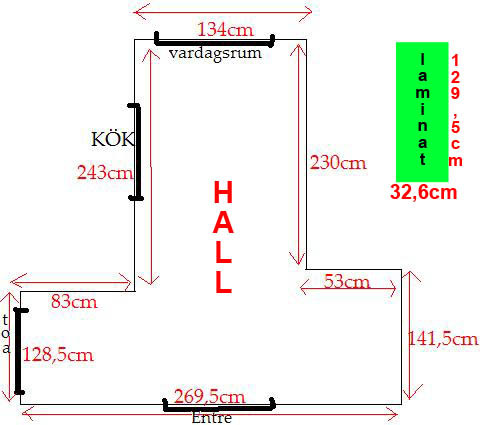 Min andra fundering är vart jag ska börja lägga golvet i hallen? Måtten på hallen finns på bild nedan, även måtten på det nya golvet.