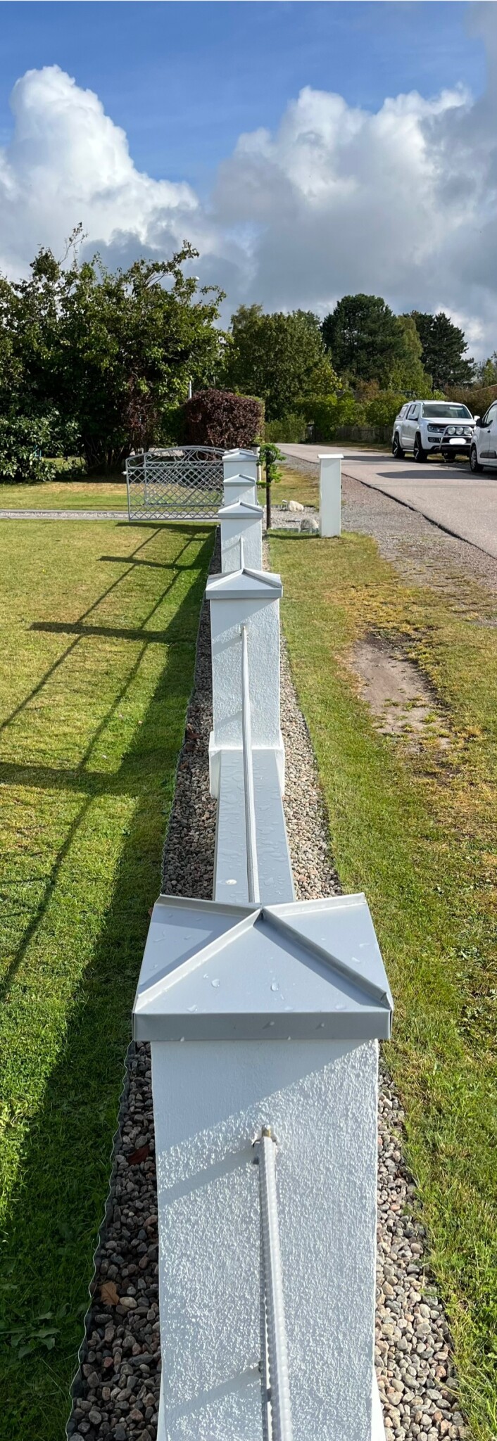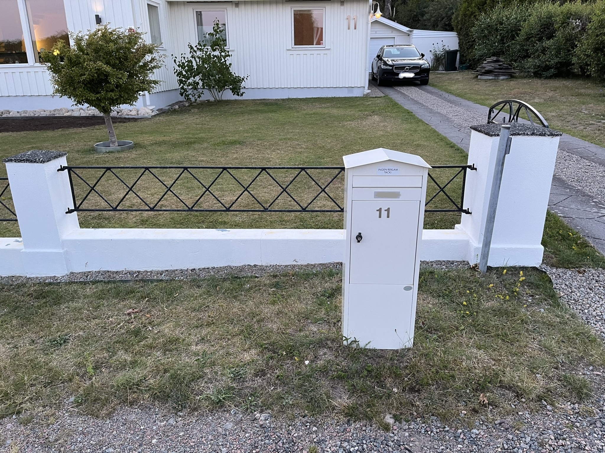 Vi har ett fint staket (ca 1960-tal) beståendes av en betongmur i marken, tegelstolpar som vi lät putsa för ett år sedan, samt sektioner av järn som vi i höstas målade om med Hammerite då de var mycket rostiga. Vi målade även all puts och betong i vitt i höstas.