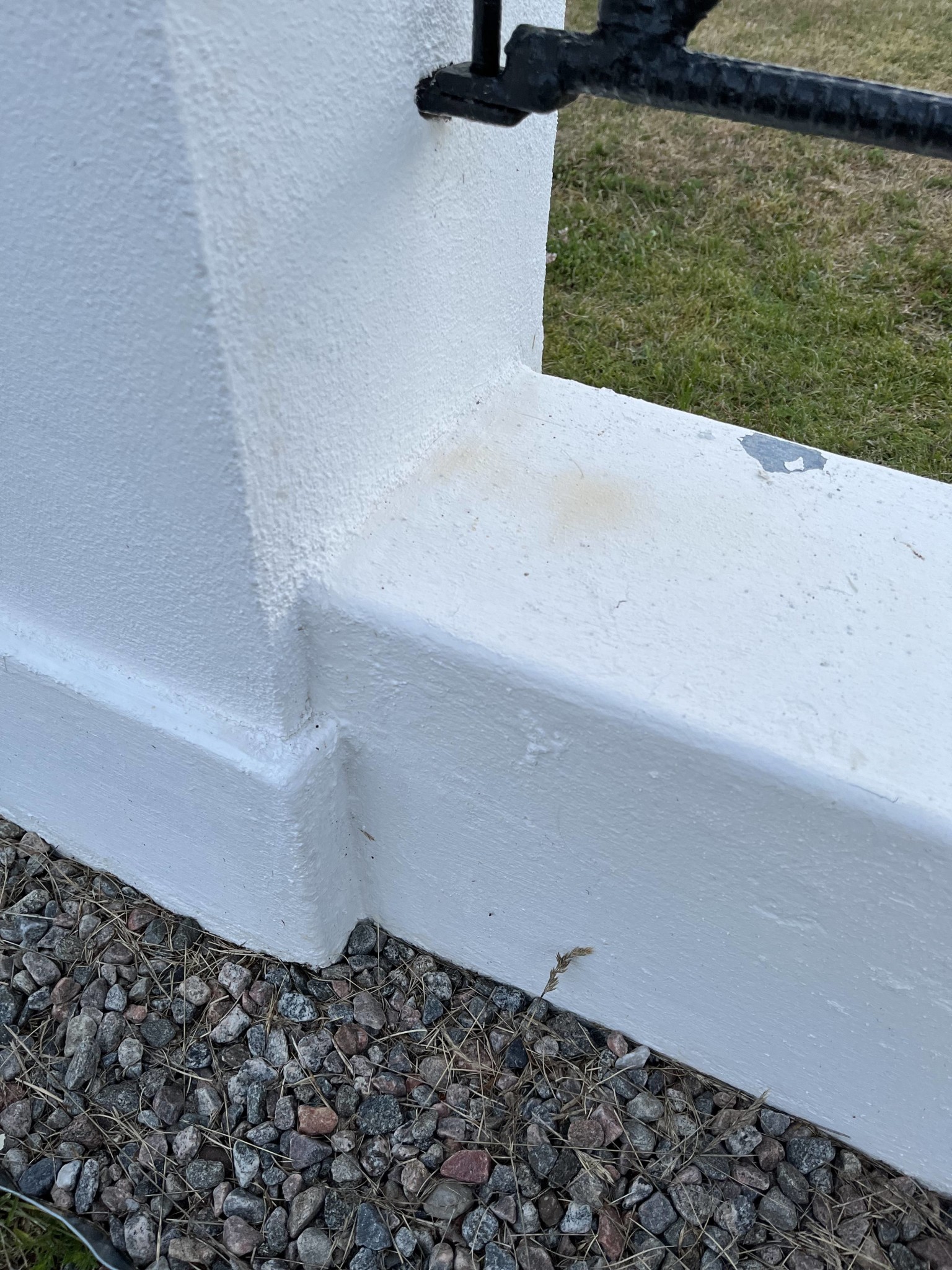 Pga tidsbrist så målade vi järnet med endast en strykning. Det dröjde dock inte länge förrän det dök upp rostfläckar på den vita markmuren. Än värre var att vita färgen på murens ovansida flagar rejält, trots att vi skrubbade rent och målade två ggr.
