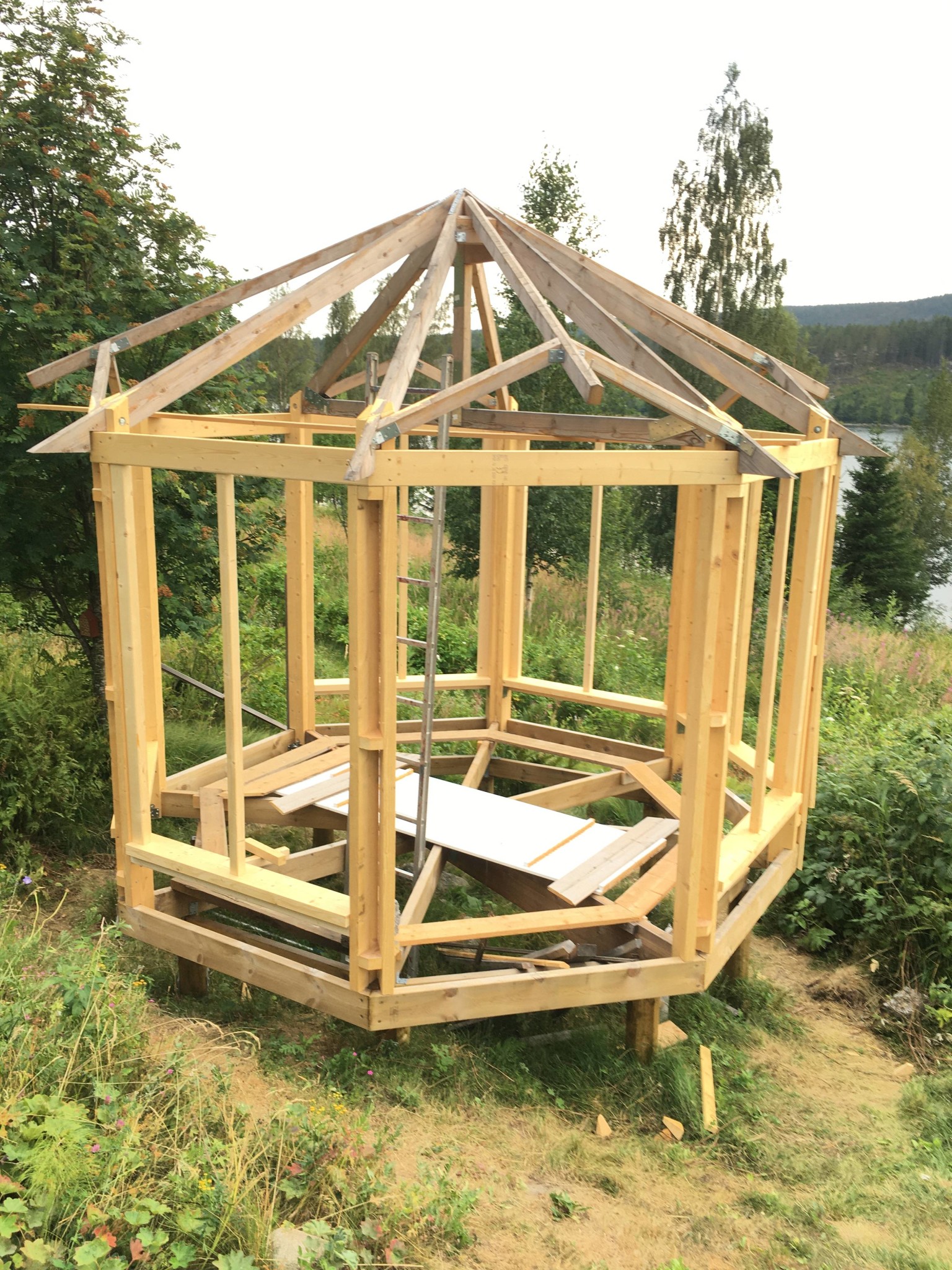 Jag bygger ett litet oisolerat åttkantigt lusthus. Det står på stolpar ca 50-120 cm över marken, som alltså sluttar.