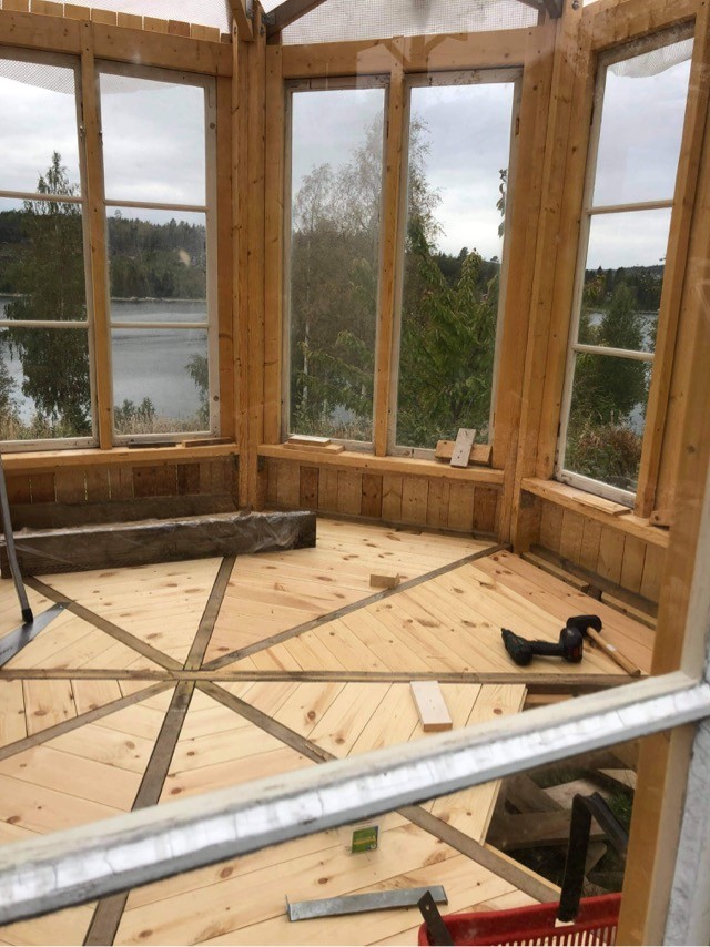 Jag planerar att lägga ett massivt spåntat grangolv 30 x 112 mm, nedfällt mellan de åtta golvåsarna, så det blir åtta fack där golvbrädorna ligger parallellt med respektive yttervägg. Varje bräda skruvas individuellt. Max längd blir ca 115 cm. Facken är ca 150 cm långa från golvets centrum till ytterväggen.